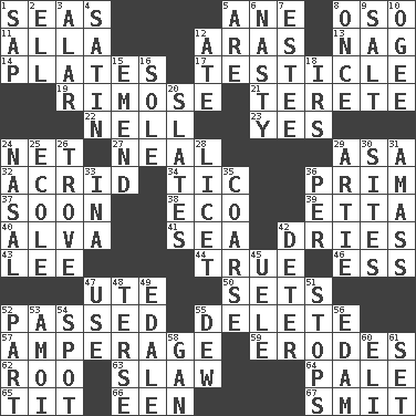 ACROSS 1. Oceans 5. A saturated hydrocarbon 8. Bear (Spanish) 11. Silent film actress Nazimova 12. Caspian sea tributary 13. Tired old horse 14. Food holders 17. A testis 19. Full of chinks, cracks, or crevices 21. Cigar-shaped 22. 1994 drama film starring Jodie Foster 23. Affirmative reply 24. Fish or hair follower 27. Actress Patricia 29. White ___ sheet 32. Bitter 34. Nervous spasm 36. Demure 37. Within a short period 38. Environmental prefix 39. Singer James 40. Inventor's middle name 41. Ocean 42. Frees from moisture 43. Area sheltered from the wind 44. Loyal 46. Double-curved letter 47. Shoshoni 50. Arranges properly for use 52. Went by 55. Keyboard key 57. Electrical Measurement 59. Eats (away) 62. Friend of Pooh 63. Cole _ (cabbage dish) 64. Light colored 65. Teat (slang) 66. Car or cant ending 67. Stricken, poetically DOWN 1. Plant excrement 2. Pipe bend 3. Having or resembling wings 4. Smooth fabric 5. "We ___ not amused" (Victoria) 6. Difficult 7. First name in cosmetics 8. Single time 9. Table seasoning 10. Double curve, resembling the letter S 12. Had dinner 15. Make improvements or corrections to 16. Flatfish 18. Big collection agency 20. Chalkboards 24. Relating to the nose 25. Learning spot: Fr. 26. Collection of objects 28. It is permitted: Lat. 29. Nick name for Arthur 30. Locates 31. Collect or gather 33. _ tizzy (2 wds.) 35. Rough 36. For each 42. Prevent from occurring 45. Ubangi River tributary 47. Purpose 48. Laconic 49. Peak District village in England 51. Ceases 52. Piece 53. Mine, in Marseilles 54. Blemish 55. Morning condensation 56. Dutch treat 58. Separate the seeds from cotton 60. Biblical high priest 61. Put into a specified state