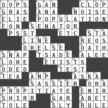 ACROSS 1. I made a mistake 5. Separate the seeds from cotton 8. Hoof sound 12. Pate de foie ____ 13. Santa ___, CA 14. Annoying sound 15. Writer Wiesel 16. Census information 19. Period of immesurable duration 20. Legislator 21. Inconspicuous attention getter 23. And so on (abbr.) 24. R.R. building 27. Actor's bit 30. Vintage cars 31. Threatening words 34. Pledge 35. Fastener 38. Sadhe (variant) 40. Toward shelter 41. Old wives' tales, e.g. 42. Is 44. Wrote a lyric poem 45. Trial 46. Beverage made from leaves 47. Electrical Unit 50. "____ silly question..." 53. More lively and spirited 57. Mouth or opening 59. Conciliate 63. Independent ruler or chieftain 64. Bake eggs in their shells 65. Slender fish 66. Collude with 67. Lacquered or enameled metalware 68. Stealthy 69. Governing power DOWN 1. Double curve, resembling the letter S 2. Fourth or lowest deck 3. Aches 4. Compass dir. 5. Stare wonderingly 6. Soon (poet.) 7. California wine valley 8. Small bed 9. Cards in a Roman deck? 10. Bear (Spanish) 11. Animal enclosure 14. Drug cop 17. Shoshoni 18. Car dealer's back yard 20. Use a swizzle stick 22. Inclined 24. Lick closed 25. Carry 26. American tennis player Robert 28. Fish or hair follower 29. Otherwise 30. Exposes to great heat 32. Saxophone 33. Prepare for publication 35. Groove 36. Thickened enlargement 37. Type of rug 39. Compass dir. 43. Russian ruler of old 47. SW Saudi Arabia district 48. Floor covering 49. Air pressure measure (abbr.) 51. Dried seaweed eaten as food 52. Satellite of Uranus 54. Droops 55. Slanted text style (abbr.) 56. Suggestive of the supernatural 58. Johnson of "Laugh-In" 59. Pacific Standard Time (abbr.) 60. 17th letter of the Greek alphabet 61. Lubricate 62. Before (prefix) 63. Ewer handle