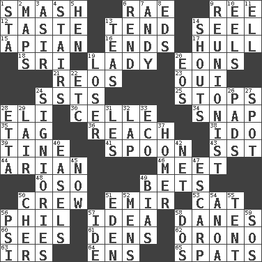ACROSS 1. Box-office sellout 6. Actress Charlotte 9. To riddle 12. Clothes sense 13. Watch over 14. Stitch closed the eyes of (a falcon) 15. Bee-related 16. Extremities 17. Frame or body of a ship 18. Indian title of respect (Mr.) 19. Kenny Rogers chart-topper in '80 20. Immeasurably long periods of time 21. Vintage cars 23. Fr. "Yes" 24. Fast planes 25. Halts 28. Biblical high priest 30. Cell (Danish) 34. Fastener 35. Label 36. Arrive at 38. Wedding promise 39. Prong on a fork 41. Soup utensil 43. Fast jet (abbr.) 44. Believer in; advocate of (suffix) 46. Confront 48. Bear (Spanish) 49. Antes 50. Ship's personnel 51. Independent ruler or chieftain 53. Domesticated feline 56. Silvers or Donahue 57. The content of cognition 58. Natives or inhabitants of Denmark 60. Observes 61. Lairs 62. U. of Maine site 63. Big collection agency 64. Followers of ems 65. Arguments over trivial matters DOWN 1. R.R. building 2. Atlas contents 3. SW Saudi Arabia district 4. Flight of steps 5. Layer 6. Tear apart 7. "60 Minutes" Commentator Rooney 8. Begley and Asner 9. One who advocates reunion 10. Snakelike fish 11. Pipe bend 13. Beverages made from leaves 14. Yells 19. Failure 20. Greek goddess of the dawn 22. And so on (abbr.) 24. Seigniories (variant) 26. Groovy apts. 27. Blemish 28. Singer James 29. Den 31. French article 32. Pet locale 33. Environmental prefix 37. Home run 40. Artist's stands 42. Fish or hair follower 45. At this time 47. Fortification 49. Prejudice 50. "Mermaids" star 51. Genesis locale 52. Not women's 54. Small Philippine buffalo 55. Portable shelter 56. 23rd letter of the Greek alphabet 57. Binary compound 58. Two (Sp.) 59. Distress signal