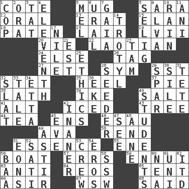 ACROSS 1. ____ d'Azur (French Riviera) 5. Large cup 8. "Two Mules for Sister ____" 12. Relating to the mouth 13. Part of Q.E.F. 15. Liveliness 16. Eucharist need 18. Den 19. 57 in ancient Rome 20. Compete 22. Of or relating to Laos or its people 24. Otherwise 26. Label 27. Remaining after all deductions 28. Symbol (abbr.) 29. Fast jet (abbr.) 32. Proofreading order 35. Person who is morally reprehensible 37. Sliced dessert 38. Thin strip of wood or metal 39. Mamie's mate 40. Table seasoning 41. Keyboard modifier key 42. On the rocks 43. Woody plant 44. Afternoon social gathering 45. Followers of ems 46. Son of Isaac 49. Actress Gardner 50. Tear apart 51. Core 55. Compass dir. 56. Water vessel 57. Blunders 59. World-weariness 63. Against 64. Vintage cars 65. Portable shelter 66. SW Saudi Arabia district 67. Compass dir. 68. Expressed in words DOWN 1. Police officer (slang) 2. Mouth or opening 3. Make lace 4. Veterans Day date 5. Cartoonist voice _ Blanc 6. Mountain range 7. Greek goddess of the earth (variant) 8. Former Milwaukee Brewers owner Bud 9. Inventor's middle name 10. Precipitation 11. Black tropical American cuckoo 14. Trinitrotoluene 17. Mediterranean tributary 21. Eastern Standard Time (abbr.) 23. Scottish cap 25. Value system 28. Sowing specialist 29. Coast Guard woman 30. Filth; sediment 31. False hair 32. Narrow board 33. Story 34. Singer James 36. Make supply last 40. SAT takers 42. Sillier 45. Night before a holiday 47. Observe 48. Queen of England 1702-14 49. Moving or stirring 51. Immeasurably long periods of time 52. Suttee (variant) 53. Group working together 54. Greek god of love 56. Sound made by sheep 58. Compass dir. 60. Teachers' org. 61. University (slang) 62. It would