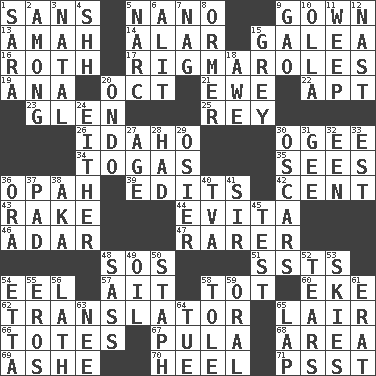 ACROSS 1. Without 5. Billionth: prefix 9. Woman's formal wear 13. Housemaid 14. Having or resembling wings 15. An organ shaped like a helmet 16. Writer of Portnoy's Complaint (1969) 17. Frustrating wastes of time 19. Santa ___, CA 20. Sep. follower 21. She-sheep 22. Fitting 23. Small, secluded valley 25. Marina Del _, California 26. Potato state 30. Double curve, resembling the letter S 34. Ancient Roman robes 35. Perceives with the eye 36. Brightly colored fish 39. Prepares for publication 42. Penny 43. Libertine 44. Webber/Rice musical 46. The sixth month of the Jewish calendar 47. Less widely known 48. Distress signal 51. Fast planes 54. Snakelike fish 57. Small island 58. Small child 60. Supplement with great effort 62. Interpreter 65. Den 66. Hauls 67. Monetary unit of Botswana 68. Length times width 69. American tennis player Robert 70. Person who is morally reprehensible 71. Inconspicuous attention getter DOWN 1. "Two Mules for Sister ____" 2. Amid 3. Brizilian seaport 4. Quiet! 5. Drug cop 6. Came down and settled, as after flight 7. Tired old horse 8. Abalone 9. E Mali city 10. Rounded earthenware pot or jar 11. Shed a tear 12. Political cartoonist Thomas 15. Jennifer or Joel 18. Deep reverence 20. Southwest Nigerian state 24. One or the other of two 27. Personal question 28. Possessed 29. Flexible twig of a willow tree 30. Motion picture awards 31. Unit of force equal to gravity 32. Car or cant ending 33. Eastern Standard Time (abbr.) 36. Mouth or opening 37. Writing tablet 38. Alias (abbr.) 40. Federal power corp. 41. Title for a knight 45. Trial 48. Backtalk 49. Petroleum 50. Staphylococcus 52. Lacerates 53. Atmospheres 54. Singer James 55. Greek god of love 56. Thin strip of wood or metal 58. Lacquered or enameled metalware 59. Of the mouth 61. Part of Q.E.F. 63. Born 64. Third day of the wk. 65. Infant locale