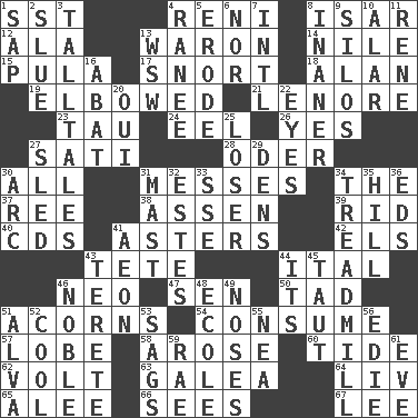 ACROSS 1. Fast jet (abbr.) 4. Painter Guido (1575-1642) 8. Austrian river, tributary to the Danube 12. Insect wing 13. Make _____ (do battle with) 14. "Death on the ____" 15. Monetary unit of Botswana 17. Derisive sound 18. ____ Jay Lerner 19. Shoved, as through a crowd 21. Poe poem 23. The 19th letter of the Greek alphabet 24. Snakelike fish 26. Affirmative reply 27. Suttee (variant) 28. River in Europe 30. 100% 31. Makes clutter 34. Definite Article 37. To riddle 38. NE Netherlands city 39. To free from 40. Music discs 41. Michaelmas daisies 42. Raised railways 43. False hair 44. Slanted text style (abbr.) 46. Modern: prefix 47. Elected rep. 50. Small amount or degree 51. Oak nuts 54. Eat 57. Ear part 58. Came up 60. Periodic rise and fall of the sea level 62. Electrical Unit 63. An organ shaped like a helmet 64. 54 in ancient Rome 65. Toward shelter 66. Observes 67. Area sheltered from the wind DOWN 1. Plant excrement 2. Change direction abruptly 3. Baron Munchausen's specialties 4. Indian princess (variant) 5. Wear away 6. Or not 7. International (abbr.) 8. Sillier 9. Grain storage towers 10. Having or resembling wings 11. French philosopher Descartes 13. Compass dir. 16. Blind as ____ 20. Fr. "Yes" 22. Sight organs 25. Failure 27. Downhill vehicle 29. Lairs 30. Curve 31. Vertical spar for supporting sails 32. _____ Park, CO 33. Compass dir. 34. Excercise machine 35. Land elevation 36. Begley and Asner 41. Age 43. Cylindrical with tapered ends 44. ___ a Wonderful Life 45. Pulled tight 46. Impressive in appearance 48. Learning spot: Fr. 49. Olfactory organs 51. Inventor's middle name 52. Calm and collected 53. Sinks 55. Teachers' org. 56. Singer Brickell 59. Actress Charlotte 61. Night before a holiday