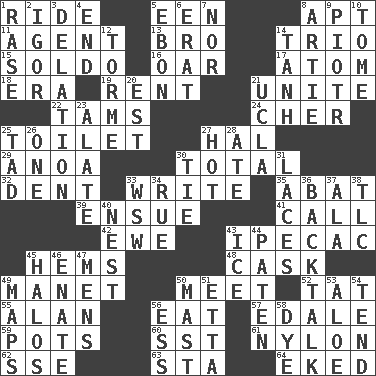 ACROSS 1. Travel on an animal 5. Car or cant ending 8. Fitting 11. Representative 13. Sis' sibling 14. Musical group of three 15. Twentieth part of a lira 16. Boat paddle 17. Smallest unit of an element 18. Epoch 19. Monthly bill 21. Join together 22. Scottish caps 24. "Mermaids" star 25. Rest room 27. Actor Linden 29. Small Philippine buffalo 30. "_____ Recall" 32. Scratch 33. Compose 35. Blind as ____ 39. Follow as a consequence or result 41. Give a ring to 42. She-sheep 43. Medicinal drug used to evoke vomiting 45. Equivocates 48. Keg 49. French painter Edouard 50. Confront 52. Make lace 55. Actor Alda or Thicke 56. Consume 57. Peak District village in England 59. Cooking vessels 60. Fast jet (abbr.) 61. High-strength synthetic material 62. Compass dir. 63. R.R. building 64. Made supply last DOWN 1. Raze (variant) 2. Russian composer Stravinsky 3. Conveyance 4. Conclude 5. Inky black, to poets 6. Part of Q.E.F. 7. Not either 8. Nick name for Arthur 9. Peter (Polish) 10. Heavy book 12. Singer Mel 14. Hyperbolic tangent 20. Eastern Standard Time (abbr.) 21. Southern CA. univ. 23. Having winglike extensions 25. Bit 26. Single 27. Being at a high temperature 28. Had dinner 30. Make a knot 31. Shoestrings 33. Compass dir. 34. Sorrow 36. Sass 37. Insect wing 38. Affectionate concern, for short 40. A home for chicks 43. Frozen water 44. Eucharist need 45. Radiant circles of light 46. Maternal 47. Not women's 49. Atlas contents 50. Vertical spar for supporting sails 51. Singer James 53. _ vera 54. Watch over 56. Curvy letter 58. Color