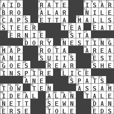 ACROSS 1. Assist 4. Pace 8. Austrian river, tributary to the Danube 12. Sis' sibling 13. Having or resembling wings 14. Mediterranean tributary 15. Balmoral and tarboosh 17. Singer James 18. Shopping centers 19. Guide 21. Afternoon social gathering 23. Erode 24. Bert's buddy 26. R.R. building 28. Rowboat 30. Nestling 34. Atlas unit 37. Roll call or roster of names 39. Type of rug 40. Cuckoo 41. Sets or collections 43. Eastern Standard Time (abbr.) 44. Travels 46. Buttocks 47. A female animal or person 48. Stimulate to action 51. Louse (plural) 54. One (Scot) 55. Arguments over trivial matters 58. Pull behind 61. "___ Little Indians" 63. Indian state 65. Standard of perfection 67. ____ Jay Lerner 71. Story 72. Remaining after all deductions 73. Stitched 74. One of the 12 tribes of Israel 75. Celtic language 76. Lacquered or enameled metalware 77. Begley and Asner DOWN 1. Lettered men learn these first 2. Feeling or showing extreme anger 3. Drug addict 4. Actress Charlotte 5. The first octave above the treble staff 6. Make lace 7. Part of Q.E.F. 8. _ tizzy (2 wds.) 9. Filth; sediment 10. Silent film actress Nazimova 11. Repose 16. Transmit 18. Floor protectors 20. River (Sp.) 22. Compass dir. 25. Blunders 27. _ moment's notice (2 wds.) 29. You are 30. Brizilian seaport 31. Angers 32. Soft 33. Yard entry 34. Wise men 35. At once, immediately (arch.) 36. Sliced desserts 38. Standoff 42. Indian titles of respect 45. Health resort 49. International (abbr.) 50. Portuguese money of account (variant) 52. Accounting whiz (abbr.) 53. Compass direction 56. Sadhe (variant) 57. Vegetable dish 58. Prong on a fork 59. Baltic tributary 60. Soaks 62. Political cartoonist Thomas 64. Not women's 66. Had dinner 68. Lion 69. Leather borer 70. Compass dir.