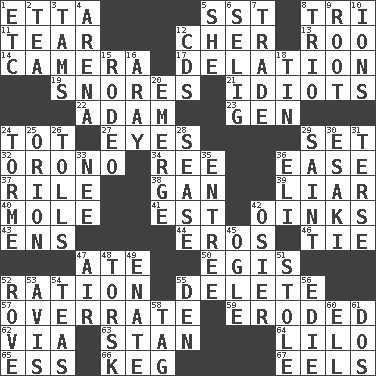 ACROSS 1. Singer James 5. Fast jet (abbr.) 8. Three (prefix) 11. Lacerate 12. "Mermaids" star 13. Friend of Pooh 14. Device for capturing images 17. Accusation by an informer 19. Sounds asleep 21. Foolish or stupid persons 22. First man 23. Commissioned military rank (abbr.) 24. Small child 27. Sight organs 29. Put into a specified state 32. U. of Maine site 34. To riddle 36. Comfort 37. Cause heat under the collar 38. Separate the seeds from cotton 39. One who doesn't tell the truth 40. Undercover agent 41. Eastern Standard Time (abbr.) 42. Pig sounds 43. Followers of ems 44. Greek god of love 46. Standoff 47. Had dinner 50. The front part of a cuirass 52. Food allowance for one day 55. Keyboard key 57. Make much ado about nothing 59. Eaten away 62. By way of 63. Comedian Laurel of Laurel & Hardy 64. _ and Stitch 65. Curvy letter 66. Cask 67. Snakelike fish DOWN 1. And so on (abbr.) 2. Beverage made from leaves 3. Scottish caps 4. Sports stadium 5. A female animal or person 6. Former Milwaukee Brewers owner Bud 7. Exchange 8. Musical group of three 9. Carrot, for example 10. Charged particles 12. Music discs 15. Cowboy competition 16. Like ___ of sunshine 18. Metal container 20. Develop 24. Singer Mel 25. Greek mythologigal hunter 26. For Whom the Bell _____ 28. Gospel singer Marvin 29. Virtuous person 30. 1973 Nobel Price Winner (Physics) Leo 31. Laconic 33. Born 35. Main course 36. Connecticut Ivy Leaguer 42. Flexible twig of a willow tree 45. Stare 47. Atmosphere 48. Cod relative 49. Related on the mother's side 51. Took without asking 52. Be footloose 53. Advice 54. Afternoon social gatherings 55. Lair 56. Singer Brickell 58. Label 60. Pipe bend 61. Two (Sp.)