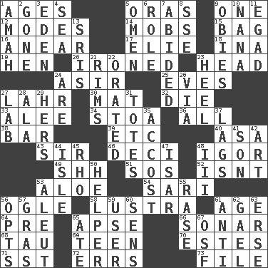 ACROSS 1. Eons 5. Mouths or openings 9. Single 12. Methods 14. Disorderly crowds 15. Paper or plastic container 16. Approach 17. Writer Wiesel 18. _ tizzy (2 wds.) 19. Layer 20. Pressed 23. Froth on beer 24. SW Saudi Arabia district 25. Nights before holidays 27. Cowardly lion portrayer 30. Floor protector 32. Pass on 33. Toward shelter 34. Portico 36. Everything 38. Soap unit 39. And so on (abbr.) 40. White ___ sheet 43. Title for a knight 46. Tenth: prefix 48. Composer Stravinsky 49. Quiet! 51. Distress signal 52. Is not 53. Medicinal plant 54. Indian skirt 56. Stare at amorously 58. A period of five years 61. Mature 64. Before (prefix) 65. Domed church section 66. Echolocation 68. The 19th letter of the Greek alphabet 69. Adolescent 70. _____ Park, CO 71. Fast jet (abbr.) 72. Blunders 73. Do some clerical work DOWN 1. Nursemaid 2. Went 3. Paradise 4. Ocean 5. Presage 6. Hero or heavy, e.g. 7. Stayed 8. Compass dir. 9. Off-Broadway awards 10. Grandmother 11. Mild oath 13. Indian titles of respect 21. Basketball hoops 22. Spoke pompously 23. Person who is morally reprehensible 24. "We ___ not amused" (Victoria) 26. By way of 27. Experiment locale 28. Insect wing 29. Possessive pronoun 31. Lugs 35. Buttonhole 37. Fails to keep up a pace 41. Manchild 42. Tate display 44. Small island 45. 17th letter of the Greek alphabet 47. Austrian river, tributary to the Danube 48. One more than two 50. Aide 53. Native American of Southwest Alaska 55. To erase 56. Elects 57. Pate de foie ____ 59. One who uses or employs something 60. Elected reps. 61. Opposed to 62. Highlander 63. Celtic language 65. Had dinner 67. Order of Saint Francis (abbr.)