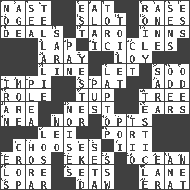 ACROSS 1. Political cartoonist Thomas 5. Consume 8. To erase 12. Double curve, resembling the letter S 13. Position in a hierarchy or organization 15. Washington bills 16. Allots cards 18. Edible starchy tuberous root 19. Lodging establishments 20. Infant locale 22. Winter's stalactites 24. Like ___ of sunshine 26. Myrna of the movies 27. Actor's bit 28. Allow 29. "Barney Miller" actor Jack 32. Body of Kaffir warriors 35. Petty quarrel 37. Increase 38. Hero or heavy, e.g. 39. Uncastrated adult male sheep 40. Family _ (genealogy) 41. "We ___ not amused" (Victoria) 42. Egg locale 43. Hearing organs 44. Teachers' org. 45. Not either 46. Chooses 49. Luau accessory 50. Left side of a ship or aircraft 51. Opts 55. One more than two 56. Greek god of love 57. Supplements with great effort 59. Sea 63. Old wives' tales, e.g. 64. Puts into a specified state 65. Unable to walk 66. Coast Guard woman 67. Simpleton 68. Part of Q.E.F. DOWN 1. Allow head to fall sleepily 2. Mature 3. Ocean 4. Copy Pinocchio 5. Eastern Standard Time (abbr.) 6. Jai _ 7. Torque (variant) 8. Turbulent 9. Singer Murray 10. Elected reps. 11. Double-curved letter 14. Bathroom 17. Indian skirt 21. Baking dish 23. Small bed 25. Last 28. Portable computer 29. "Two Mules for Sister ____" 30. Baltic tributary 31. Lyric poems 32. SW Asia republic 33. Greater amount 34. Entreaty 36. Fluid product of inflammation 40. A testis 42. Annoying sounds 45. Modern: prefix 47. Luau course 48. Musical group of three 49. Failure 51. Riding implement 52. Israeli folk dance 53. Made supply last 54. Stalk of a moss capsule 56. Raised railways 58. Compass dir. 60. Ewer handle 61. Wet nurse (var.) 62. Fish or hair follower