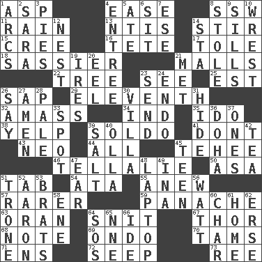 ACROSS 1. Cleo's killer 4. Relaxation 8. Compass dir. 11. Precipitation 13. Nuclear Threat Initiatives 14. Commotion 15. Algonquian 16. Wig 17. Lacquered or enameled metalware 18. More disrespectful 21. Shopping centers 22. Family _ (genealogy) 23. Observe 25. Eastern Standard Time (abbr.) 26. Plant excrement 29. Veterans Day date 32. Collect or gather 34. Indiana (abbr.) 35. Wedding promise 38. Sharp bark 39. Twentieth part of a lira 41. Do not 43. Modern: prefix 44. 100% 45. Giggle 46. Copy Pinocchio 50. White ___ sheet 51. Keyboard key 54. "One Day ___ Time" 55. Afresh 57. Less widely known 59. Flamboyance 63. Northwest Algerian city 64. In a ____ (agitated or irritated) 67. Son of Odin 68. Musical sound 69. Southwest Nigerian state 70. Scottish caps 71. Followers of ems 72. Ooze 73. To separate or throw off DOWN 1. Curves 2. "Two Mules for Sister ____" 3. Sliced desserts 4. Main course 5. Had dinner 6. Be seated 7. Compass dir. 8. Fur scarf 9. Beverly of Met fame 10. Take or capture by force 12. A home for chicks 14. R.R. building 19. Angers 20. Snakelike fish 21. Was introduced to 23. Transmit 24. Inside; within (prefix) 26. Declare 27. So be it 28. Diluted with white 30. Country residence 31. Flintstone garb 33. Blemish 36. Capital of the state of Qatar 37. Singles 39. Table seasoning 40. Water jar 42. Beverage made from leaves 45. Adolescent 47. Hearing organ 48. Portable computer 49. _ tizzy (2 wds.) 51. Heavy duty weighing machine 52. Composer Copland 53. Naughty children 56. Electrical Unit 58. Compass dir. 60. Burn to charcoal 61. Dwelling 62. Celtic language 64. Distress signal 65. Compass dir. 66. Binary compound