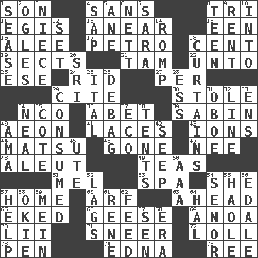 ACROSS 1. Male offspring 4. Without 8. Three (prefix) 11. Armor plate that protects the chest 13. Approach 15. Car or cant ending 16. Toward shelter 17. Stone: prefix 18. Penny 19. Religious groups 21. Scottish cap 22. To (old English) 23. Compass dir. 24. To free from 27. For each 29. Quote 30. Took without asking 34. Non-commissioned officer (abbr.) 36. Collude with 39. Unit of acoustic absorption 40. A really long time 41. Shoestrings 43. Charged atoms 44. Taiwanese island in East China Sea 46. Went 47. Born 48. Native American of Southwest Alaska 49. Afternoon social gatherings 51. Cartoonist voice _ Blanc 53. Health resort 54. A female animal or person 57. Dwelling 60. Sandy's bark 63. Forward in time 65. Supplemented with great effort 66. Honkers 69. Small Philippine buffalo 70. Cards in a Roman deck? 71. Contemptuous expression 72. Hang loosely or laxly 73. Animal enclosure 74. Pulitzer Prize-winning author Ferber 75. Portuguese money of account (variant) DOWN 1. Gospel singer Marvin 2. Stares 3. Sibling's daughter 4. Plant excrement 5. A saturated hydrocarbon 6. Remaining after all deductions 7. "Two Mules for Sister ____" 8. Adolescent 9. Monthly bill 10. To the inside or interior of 12. Arrange properly for use 14. Play 18. Window treatments 20. Indian title of respect (Mr.) 25. Slanted text style (abbr.) 26. Debunk (Brit. slang) 28. Double-curved letter 29. Ingested 31. Mitch Miller's instrument 32. Actor's bit 33. Followers of ems 34. Be tempered by heat 35. ____ d'Azur (French Riviera) 37. Environmental prefix 38. Portable shelters 40. Nursemaid (var.) 42. Ooze 45. Shoshoni 50. Auto club (abbr.) 52. Falls behind 54. Sir (Sp.) 55. White Person, in Hawaii 56. Peak District village in England 57. Aid 58. Migrant worker of the '30s 59. Count _ (2 wds.) 61. French philosopher Descartes 62. Nourish 64. Actor Linden 67. Elected rep. 68. Epoch