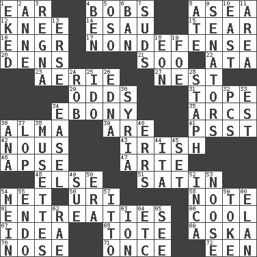 ACROSS 1. Hearing organ 4. Moves up and down 8. At sea 12. Leg joint 14. He sold his birthright 15. Pull into pieces 16. Engineer (abbr.) 17. Unrelated to defense, as in spending 20. Cub Scout units 21. "Barney Miller" actor Jack 22. _ moment's notice (2 wds.) 23. Nest on high 27. A home for chicks 29. Probability 31. Drink excessively 34. Dark wood 35. Arches 36. _ mater 39. "We ___ not amused" (Victoria) 41. Inconspicuous attention getter 42. Horse sense 43. From or relating to Ireland 46. Domed church section 47. Johnson of "Laugh-In" 48. Otherwise 51. Smooth fabric 54. Was introduced to 56. RI univ. 58. Make mention of 61. Pleas 66. Calm and collected 67. It may be bright or harebrained 68. Carryall 69. "____ silly question..." 70. Characteristic smell of wine 71. At one time in the past 72. Car or cant ending DOWN 1. Supplemented with great effort 2. Queen of England 1702-14 3. Rain (Swedish) 4. Benjamin's nick name 5. Bear (Spanish) 6. Prohibit 7. Beer foam 8. Had dinner 9. Legislators 10. 90 degrees 11. Length times width 13. Celtic language 18. A really long time 19. Enemy 24. Director Reiner 25. Wedding promise 26. Pulitzer Prize-winning author Ferber 28. Staphylococcus 30. Damascus' land 32. Personal Computers (abbr.) 33. Eastern Standard Time (abbr.) 34. Artist's stand 36. Santa ___, CA 37. Chop off 38. French bagpipes 40. Blunders 44. Call ___ day 45. Arrange properly for use 49. Take to court 50. Epoch 52. South American Indian 53. Trap for birds or small mammals 54. Count _ (2 wds.) 55. Inside; within (prefix) 57. "Tell ____ the Marines!" 59. Casino tip 60. Liveliness 62. Actress Charlotte 63. Electrically charged atom 64. And so on (abbr.) 65. Observe
