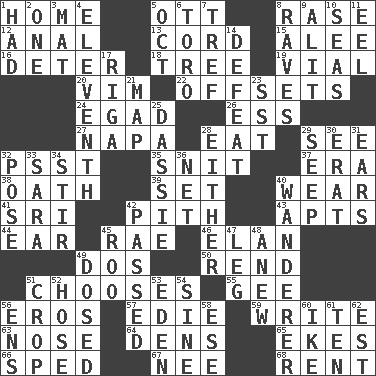 ACROSS 1. Dwelling 5. Baseball player Mel 8. To erase 12. Of or related to the anus 13. Drawstring 15. Toward shelter 16. Prevent from occurring 18. Woody plant 19. Small bottle 20. Zeal 22. Compensates for 24. Mild oath 26. Curvy letter 27. California wine valley 28. Erode 29. Observe 32. Inconspicuous attention getter 35. In a ____ (agitated or irritated) 37. Period 38. Pledge 39. Arrange properly for use 40. Erode 41. _ Lanka 42. Essential or central part 43. Flats, for short 44. Ewer handle 45. Actress Charlotte 46. Style 49. Two (Sp.) 50. Tear apart 51. Elects 55. Turn to the right 56. Greek god of love 57. Singer Brickell 59. Compose 63. Sense of smell 64. Hiding places for outlaws 65. Makes supply last 66. Moved rapidly 67. Born 68. Monthly bill DOWN 1. Possessed 2. Single 3. Floor protector 4. Veterans Day date 5. Sep. follower 6. "Corrida" creature 7. Unclean, religiously 8. All-night dance parties 9. Came down and settled, as after flight 10. Oceans 11. Snakelike fish 14. Outscore 17. Capital of Latvia 21. Atlas unit 23. Fast jet (abbr.) 25. Hyrax 28. One or the other 29. Ooze 30. Part of Q.E.F. 31. Hearing organs 32. Airs 33. "Two Mules for Sister ____" 34. Commotion 36. Fish or hair follower 40. Roamer 42. Went by 45. Friend of Pooh 47. Part of a journey 48. Afresh 49. Administered medicine 51. Riding implement 52. Flexible conduit 53. Locale of original sin 54. Trig term 56. Followers of ems 58. Compass dir. 60. D.D.E's nickname 61. "___ Little Indians" 62. Eastern Standard Time (abbr.)