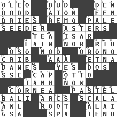 ACROSS 1. Margarine 5. Partially opened flower 8. Lair 11. Texas town _ City 12. Smallest unit of an element 14. Car or cant ending 15. Frees from moisture 17. San ____ (Riviera town) 18. Light colored 19. Sowing specialist 21. Michaelmas daisies 23. Afternoon social gathering 25. Austrian river, tributary to the Danube 26. (Had) reclined 27. Not either 28. To free from 31. Bear (Spanish) 33. Dreamland 35. U. of Maine site 37. Baby bed with high sides 38. American Automobile Association (abbr.) 40. Inactive volcano in Sicily 41. Natives or inhabitants of Denmark 43. It is so 45. Two (Sp.) 46. Compass dir. 47. Head covering 50. Von Bismarck 52. Hyperbolic tangent 53. Immediately 54. Pupil covering 56. Soft color 61. Indonesian resort city 62. Curves 65. Any of the three canals of the cochlea 66. Leather borer 67. Carrot, for example 68. Mountain range southwest of Kyrgyzstan 69. Girls' org. (abbr.) 70. Health resort 71. Look after DOWN 1. Probability 2. Old wives' tales, e.g. 3. Singer Brickell 4. Wrote a lyric poem 5. Tavern 6. Shoshoni 7. Kingdom 8. Letter starter 9. Snakelike fish 10. Compass dir. 13. With motion or animation 16. Stalk of a moss capsule 18. For each 20. It's straight from the horse's mouth 22. Edible starchy tuberous root 24. Small Philippine buffalo 26. Ear part 28. Printing process, for short 29. Taverns 30. ___ good deed 31. Mouths or openings 32. Trig term 34. 24 hours 36. Make new 37. Music discs 39. Age 42. Glance over 44. Obstruct or block passage 48. Approach 49. N Egypt peninsula 51. It was, poetically 52. Three (prefix) 54. Crow sounds 55. Rounded earthenware pot or jar 57. Go away! 58. Falsehood 59. Style 60. Put down 61. Container for groceries 63. Police officer (slang) 64. R.R. building
