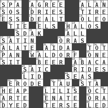 ACROSS 1. Health resort 4. Match 9. ____ Jay Lerner 13. Mayday 14. Frees from moisture 15. Become fatigued 16. Double-curved letter 17. Started a card game 18. Butter sub 19. Standoff 21. Raised railways 22. Saint headwear 24. Neighbor of Neb. 26. Everything 27. Smooth fabric 29. Mouths or openings 30. Having winglike extensions 31. Opera by Verdi 33. Small child 36. Baking dish 37. Apple salad 40. Single 41. Be seated 42. Fermented drink made from hops 43. Phillipine bananalike plant 45. Ketch in the Levant 47. Amusement-park features 48. Hat (slang) 49. Oceans 50. Wear away 52. The 19th letter of the Greek alphabet 54. R.R. building 56. Pile 57. Ms. Damita and namesakes 59. Sep. follower 61. Johnson of "Laugh-In" 62. Related on the mother's side 63. Mouth or opening 64. Colored 65. Laconic 66. Directed DOWN 1. Compass dir. 2. Mail 3. Aide 4. Increase 5. Hellenic 6. Monetary unit of Yemen 7. Snakelike fish 8. Eastern Standard Time (abbr.) 9. Ringlike coral islands and reefs 10. _ and Stitch 11. Ancient Greek god of war 12. Modern: prefix 20. Prepare for publication 22. Ethiopian city, capital of Harari 23. In the manner of 25. Afresh 27. Plant excrements 28. Jai ____ 29. Scent 31. Actor Baldwin 32. Binary compound 33. Inedible or poisonous agaric 34. At one time in the past 35. Afternoon social gatherings 38. Tolerate 39. Conductor's collection 44. Prejudice 45. Had an oblique or slanted direction 46. Help 49. Sets of matching outer garments 50. Suggestive of the supernatural 51. Pace 52. Prong on a fork 53. Having or resembling wings 55. Measure of real estate 56. Possessed 57. Allow 58. Perceive with the eye 60. Small amount or degree