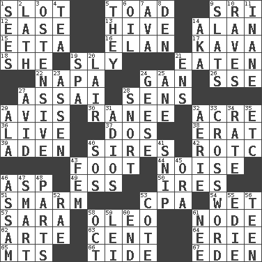 ACROSS 1. Narrow, elongated depression 5. Frog relative 9. Indian title of respect (Mr.) 12. Comfort 13. Hub of activity 14. Actor Alda or Thicke 15. Singer James 16. Style 17. Polynesian shrub of the pepper family 18. A female animal or person 19. Insidious 21. Eroded 22. California wine valley 24. Separate the seeds from cotton 26. Compass dir. 27. Slender Brazilian palm 28. Elected reps. 29. Advice 30. The wife of a rajah (variant) 32. 1/640 square mile 36. Moving, as bait 37. Two (Sp.) 38. Part of Q.E.F. 39. Arabian gulf 40. Male parents of animals 42. College mil. group 43. Pick up the tab 44. Annoying sound 46. Viper 49. Double-curved letter 50. Angers 51. Excessive but superficial compliments 53. Accounting whiz (abbr.) 54. Dripping 57. "Two Mules for Sister ____" 58. Butter sub 61. Connecting point 62. Johnson of "Laugh-In" 63. Penny 64. 4th largest of the Great Lakes 65. Mountains (abbr.) 66. Periodic rise and fall of the sea level 67. Genesis locale DOWN 1. Observes 2. Thin strip of wood or metal 3. Clearly or manifestly demonstrative 4. Afternoon social gathering 5. Those things 6. Petroleum 7. Actress Gardner 8. Lair 9. Narrow boards 10. All-night dance parties 11. Silly 14. Alias (abbr.) 19. Health resort 20. Den 21. Followers of ems 23. NE Netherlands city 24. Honkers 25. One (Scot) 27. Enthusiastic 28. Derisive sound 29. Chicken ___ king 31. Goodbye (Sp.) 32. Nest on high 33. What you're doing now 34. Pace 35. And so on (abbr.) 40. Mayday 41. Clip 43. Opposite of masc. 45. Mouth or opening 46. Indian state 47. Don Adams' spy role 48. Components 52. Actress Charlotte 53. ____ d'Azur (French Riviera) 55. Singer Brickell 56. Adolescent 58. Sep. follower 59. Luau accessory 60. Conclude 61. Born