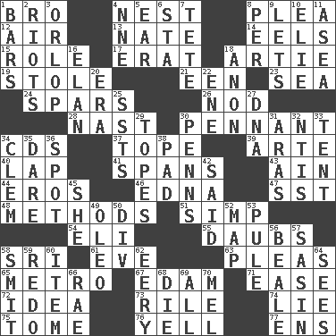 ACROSS 1. Sis' sibling 4. A home for chicks 8. Entreaty 12. Atmosphere 13. Nathan's nickname 14. Snakelike fish 15. Hero or heavy, e.g. 17. Part of Q.E.F. 18. Nick name for Arthur 19. Took without asking 21. Car or cant ending 23. Ocean 24. Practice fights 26. Lower and raise head in agreement 28. Political cartoonist Thomas 30. Pre-World Series prize 34. Music discs 37. Drink excessively 39. Johnson of "Laugh-In" 40. Infant locale 41. Connects, as a bridge 43. The 18th letter of the Arabic alphabet 44. Greek god of love 46. Pulitzer Prize-winning author Ferber 47. Fast jet (abbr.) 48. Modes 51. Simple or foolish person 54. Connecticut Ivy Leaguer 55. Applies to a surface 58. _ Lanka 61. First lady 63. Entreaties 65. Paris' subway 67. Dutch treat 71. Relaxation 72. The content of cognition 73. Cause heat under the collar 74. Untruth 75. Heavy book 76. Shout 77. Followers of ems DOWN 1. Taverns 2. Disturbances 3. Lowest deck of a ship 4. Compass dir. 5. Hearing organ 6. R.R. building 7. Wig 8. For each 9. Allows 10. Writer Wiesel 11. Toward the sea 16. Style 18. At once, immediately (arch.) 20. Period 22. Compass dir. 25. Fast planes 27. Heredity factor (abbr.) 29. Drinks excessively 30. Actor Sean's family 31. Caspian sea tributary 32. Nuclear Threat Initiatives 33. Portable shelter 34. Clement's nick name 35. Have the gumption 36. Specific locale 38. Groovy apt. 42. Stated 45. A female animal or person 49. Margarine 50. HTML Container Element 52. Atlas unit 53. Whine 56. Calif. Air Force Base 57. Indian antelope 58. Stricken, poetically 59. Make new 60. A distinct part 62. Suggestive of the supernatural 64. Observes 66. Actress Charlotte 68. Pass on 69. Everything 70. Cartoonist voice _ Blanc