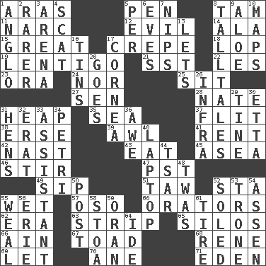 ACROSS 1. Caspian sea tributary 5. Animal enclosure 8. Scottish cap 11. Drug cop 12. Morally bad or wrong 14. Wing 15. Relatively large 17. Streamer paper 18. Trim (branches) 19. Small, flat, pigmented spot on the skin 21. Fast jet (abbr.) 22. French article 23. Mouth or opening 24. And not 25. Be seated 27. Elected rep. 28. Nathan's nickname 31. Pile 35. Ocean 37. Sudden quick movement 38. Celtic language 39. Leather borer 41. Monthly bill 42. Political cartoonist Thomas 43. Ingest 45. Toward the sea 46. Move through with a circular motion 47. Pacific Standard Time (abbr.) 49. Small drink 51. The 23rd letter of the Hebrew alphabet 52. R.R. building 55. Soggy 57. Bear (Spanish) 60. Speakers 62. Epoch 63. Long narrow piece of something 65. Grain storage towers 66. The 18th letter of the Arabic alphabet 67. Frog relative 68. French philosopher Descartes 69. Allow 70. A saturated hydrocarbon 71. Paradise DOWN 1. White American of non-Hispanic descent 2. More uncommon 3. Sports stadium 4. Get outta here! 5. For each 6. Nights before holidays 7. Cuts off 8. Baron Munchausen's specialties 9. _ vera 10. Atlas contents 13. Allows 16. Metal containers 17. Pupil covering 20. Moves 26. Kind of red light 29. Prong on a fork 30. Singer James 31. Coop moms 32. Part of Q.E.F. 33. Aide 34. _ dish (used to culture cells) 36. Deep reverence 40. Portable computer 44. Russian ruler of old 48. It was, poetically 50. Mail 52. Having a sole or soles 53. Marketplace scale 54. NE Netherlands city 55. Welt 56. One of the Great Lakes 58. Portico 59. Northwest Algerian city 61. Hoop that covers a wheel 64. Binary compound