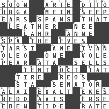 ACROSS 1. Within a short period 5. Johnson of "Laugh-In" 9. Von Bismarck 13. Capital and largest city of Mongolia 14. Count _ (2 wds.) 15. Ooze 16. Hearing organs 17. Connects, as a bridge 18. Not this but _ 19. Cordwainer's material 21. Born 22. Cowardly lion portrayer 23. Singer Murray 24. Health resort 27. Definite Article 28. Nights before holidays 29. Tarsus (plural) 31. Deep reverence 32. "Terrible" tsar 36. Margarine 37. Single 38. Short-tailed, large-bodied rat 39. Lightbulb-shaped fruit 40. "One Day ___ Time" 41. Exchanges for money 42. Portable shelter 44. Sep. follower 46. Make lace 47. Hoop that covers a wheel 48. Vintage cars 50. R.R. building 51. Legislator 54. Mountain range southwest of Kyrgyzstan 56. Honor 58. Makes supply last 60. Redecorate 61. Opinion 62. Celtic language 63. Locale of original sin 64. Periodic rise and fall of the sea level 65. Assign a rank or rating to DOWN 1. Take to court 2. Of the mouth 3. Legendary monster 4. Relating to the nose 5. Electrical Unit 6. Located in or toward the back 7. Metal container 8. Followers of ems 9. Clearly or manifestly demonstrative 10. Giggle 11. Beverage made from leaves 12. Elect 17. Quiet! 20. Jacques of French films 21. Compass dir. 23. "___ Maria" 24. Obstruct or block passage 25. Light colored 26. Length times width 28. She-sheep 30. Determination 31. Santa ___, CA 33. Electrical Unit 34. Silent film actress Nazimova 35. A home for chicks 37. Baseball player Mel 40. One (Scot) 41. Portico 43. Period 44. Threatening words 45. Penny 47. Sadhe (variant) 49. Navigate 51. Expressed in words 52. Gumbo ingredient 53. State of inaction 54. "We ___ not amused" (Victoria) 55. Directed 56. Consume 57. 16 59. Observe
