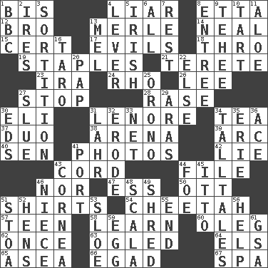 ACROSS 1. Twice 4. One who doesn't tell the truth 8. Singer James 12. Sis' sibling 13. Haggard of country music 14. Anneal 15. Certainty 17. Vices 18. Through, poetically 19. Paper fasteners 21. Cylindrical with tapered ends 23. Retirement account (abbr.) 24. 17th letter of the Greek alphabet 26. Area sheltered from the wind 27. Halt 28. Raze (variant) 30. Biblical high priest 31. Poe poem 34. Beverage made from leaves 37. Superhero pair 38. Sports stadium 39. Curve 40. Elected rep. 41. Pictures 42. Whopper 43. Drawstring 44. Do some clerical work 46. Or not 47. Double-curved letter 50. Baseball player Mel 51. Upper-body garments 54. Leopard's kin 57. Adolescent 58. Acquire or gain knowledge or skills 60. Cassini of fashion 62. Single time 63. Stared at amorously 64. Raised railways 65. Toward the sea 66. Mild oath 67. Health resort DOWN 1. English channel? 2. Angers 3. Making a chance decision by using lots 4. Prying instrument 5. From or relating to Ireland 6. 100% 7. Relief 8. Main course 9. Giggle 10. Small pie 11. Medicinal plant 13. Cartoonist voice _ Blanc 16. Pacific island yam 20. Infant food 22. Otherwise 25. U. of Maine site 27. Change direction abruptly 29. Caspian sea tributary 30. Begley and Asner 31. Cowardly lion portrayer 32. Eat (away) 33. Fish or hair follower 34. Baron Munchausen's specialties 35. 4th largest of the Great Lakes 36. Adept person 41. Sweet dark-red dessert wine 43. Pupil covering 44. Enemy 45. "Tell ____ the Marines!" 46. Sibling's daughter 48. Any of the three canals of the cochlea 49. Tear up 51. Portico 52. Coop moms 53. _ gin 55. Conclude 56. Assist 59. Oval reproductive body of a fowl 61. Girls' org. (abbr.)