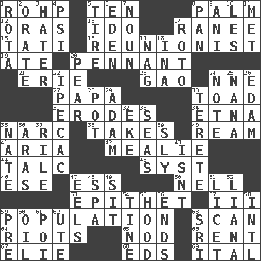 ACROSS 1. Frolic 5. Nine, plus one 8. Inside of hand 12. Mouths or openings 13. Wedding promise 14. The wife of a rajah (variant) 15. Jacques of French films 16. One who advocates reunion 19. Had dinner 20. Pre-World Series prize 21. 4th largest of the Great Lakes 23. E Mali city 24. Compass dir. 27. Dad 30. Frog relative 31. Eats (away) 34. Inactive volcano in Sicily 35. Drug cop 38. Proceeds 40. 480, 500 or 516 sheets of paper 41. Roberta Peters solo 42. Ear of corn 44. Baby powder 45. System (abbr.) 46. Compass dir. 47. Double-curved letter 50. 1994 drama film starring Jodie Foster 53. Curse 57. One more than two 59. Census information 63. Examine minutely or intensely 64. Debaucheries 65. Dreamland 66. Monthly bill 67. Writer Wiesel 68. Begley and Asner 69. Slanted text style (abbr.) DOWN 1. Roll call or roster of names 2. Speak pompously 3. Mother 4. 23rd letter of the Greek alphabet 5. Hoop that covers a wheel 6. Locale of original sin 7. Part of speech 8. Baking dish 9. Black tropical American cuckoo 10. French article 11. Was introduced to 14. Printing process, for short 17. Tired old horse 18. _ tizzy (2 wds.) 20. Lightbulb-shaped fruit 22. Medicinal drug used to evoke vomiting 24. Short letter 25. Nanny 26. Dutch treat 28. Cooking vessel 29. First man 30. Cigar-shaped 32. Make supply last 33. Oceans 35. Nathan's nickname 36. Caspian sea tributary 37. Cause heat under the collar 39. Insidious 43. Is not 47. Snakelike fish 48. Health resort 49. Be seated 51. It is permitted: Lat. 52. Climbing, woody, usually tropical vines 54. Prong on a fork 55. Parka part 56. Conclusions 58. International (abbr.) 59. Before (prefix) 60. Lubricate 61. Luau course 62. Shoshoni 63. Indian title of respect (Mr.)