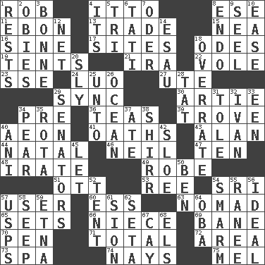 ACROSS 1. Director Reiner 4. "Tell ____ the Marines!" 8. Compass dir. 11. Inky black, to poets 13. Exchange 15. Teachers' org. 16. Trig term 17. Locates 18. Lyric poems 19. Portable shelters 21. Retirement account (abbr.) 22. Short-tailed, large-bodied rat 23. Compass dir. 24. Nilotic language 27. Shoshoni 29. Synchronize (abbr.) 30. Nick name for Arthur 34. Before (prefix) 36. Beverages made from leaves 39. Collection of objects 40. A really long time 41. Curses 43. ____ Jay Lerner 44. Brizilian seaport 46. Famous astronaut Armstrong 47. Nine, plus one 48. Feeling or showing extreme anger 49. Loose flowing garment 51. Baseball player Mel 53. To sift 54. _ Lanka 57. One who uses or employs something 60. Curvy letter 63. Roamer 65. Puts into a specified state 66. Sibling's daughter 69. Object of repulsion 70. Writing instrument 71. Add up to 72. Length times width 73. Health resort 74. Negative votes 75. Cartoonist voice _ Blanc DOWN 1. Musical pauses 2. Off-Broadway awards 3. Child's nurse 4. ___ a Wonderful Life 5. Three (prefix) 6. Jacques of French films 7. River in Europe 8. Inside; within (prefix) 9. Stitch closed the eyes of (a falcon) 10. Relaxation 12. Fish or hair follower 14. He sold his birthright 18. Make much ado about nothing 20. Playfully artful 25. To (old English) 26. Sea 28. Make lace 29. Legislators 31. Lacquered or enameled metalware 32. "Terrible" tsar 33. Car or cant ending 34. Lightbulb-shaped fruit 35. Round or rotation of duties 37. Had dinner 38. Bake eggs in their shells 40. Cuckoo 42. _ gin 45. Allow 50. Benjamin's nick name 52. Portable shelter 54. Excessive but superficial compliments 55. Indian princess (variant) 56. Perfect 57. United States Postal Service (abbr.) 58. Ooze 59. Inactive volcano in Sicily 61. The Jewish people; Israel 62. Bristle 64. Chief or king in Benin or Nigeria 67. Island 68. Raised railways