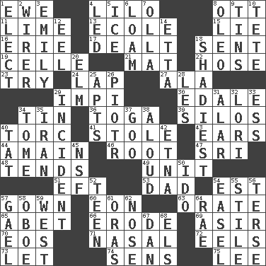 ACROSS 1. She-sheep 4. _ and Stitch 8. Baseball player Mel 11. Welles in "The Third Man" 13. Learning spot: Fr. 15. Untruth 16. One of the Great Lakes 17. Started a card game 18. Posted 19. Cell (Danish) 21. Floor protector 22. Flexible conduit 23. Attempt 24. Infant locale 27. Chicken ___ king 29. Body of Kaffir warriors 30. Peak District village in England 34. Metal container 36. Ancient Roman robe 39. Grain storage towers 40. Torque (variant) 41. Took without asking 43. Hearing organs 44. At full speed 46. Carrot, for example 47. _ Lanka 48. Is inclined (to) 49. A single undivided whole 51. Bank Draft (abbr.) 53. June honoree 54. Eastern Standard Time (abbr.) 57. Bride's dress 60. A really long time 63. Declaim 65. Collude with 66. Wear away 69. SW Saudi Arabia district 70. Greek goddess of the dawn 71. Relating to the nose 72. Snakelike fish 73. Allow 74. Elected reps. 75. Area sheltered from the wind DOWN 1. Choose 2. One who wires 3. Poet Dickinson 4. Directed 5. Frozen water 6. Rich soil 7. Rounded earthenware pot or jar 8. Butter sub 9. Metal containers 10. False hair 12. Snakelike fish 14. Singer James 18. Most dark, concealed or hidden 20. Shade tree 25. Flats, for short 26. Peter (Polish) 28. French article 29. Event 31. Having or resembling wings 32. Australian parrot (variant) 33. Double-curved letter 34. Heavy book 35. SW Asia republic 37. Thick or sticky substance 38. Verbally 40. Make lace 42. Inactive volcano in Sicily 45. Science/research agcy. 50. Wedding promise 52. Adolescent 54. Artist's stand 55. Vertical member of a panel or frame 56. Laconic 57. Highlander 58. Mitch Miller's instrument 59. 270 degrees 61. Mouths or openings 62. Sense of smell 64. Actress Charlotte 67. One of the 12 tribes of Israel 68. Raised railways