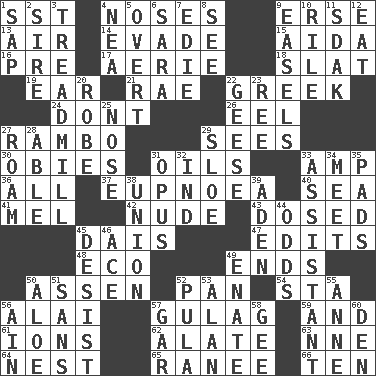 ACROSS 1. Fast jet (abbr.) 4. Olfactory organs 9. Celtic language 13. Atmosphere 14. Dodge 15. Opera by Verdi 16. Before (prefix) 17. Nest on high 18. Narrow board 19. Ewer handle 21. Actress Charlotte 22. Of Greece 24. Do not 26. Snakelike fish 27. Role for Stallone 29. Observes 30. Off-Broadway awards 31. Lubricates 33. Electrical Unit 36. Everything 37. Normal relaxed breathing 40. Ocean 41. Cartoonist voice _ Blanc 42. Unadorned 43. Administered medicine 45. Raised platform 47. Proofreads 48. Environmental prefix 49. Extremities 50. NE Netherlands city 52. Baking dish 54. R.R. building 56. Jai _ 57. Russian prison camp 59. Also 61. Charged atoms 62. Having winglike extensions 63. Compass dir. 64. A home for chicks 65. The wife of a rajah (variant) 66. Nine, plus one DOWN 1. Plant excrement 2. The founder of a family 3. Excercise machine 4. Teachers' org. 5. Unconcealed 6. "Two Mules for Sister ____" 7. Singer Brickell 8. Observe 9. Artist's stands 10. Cause heat under the collar 11. Neighbor of Neb. 12. Consume 20. Loose flowing garment 22. Honkers 23. To separate or throw off 25. Sense of smell 27. Wander 28. Competent 29. _ gin 31. Musical composition 32. Working for oneself (abbr.) 33. Aide 34. Rendezvous 35. Writing tablets 38. The state of being joined or united 39. An important port of Yemen 44. Likelihood 45. Cease 46. Adept person 49. Related on the mother's side 50. Medicinal plant 51. Without 52. Monetary unit of Botswana 53. ____ Jay Lerner 55. Queen of England 1702-14 56. The 18th letter of the Arabic alphabet 57. Slender fish 58. Turn to the right 60. Lair