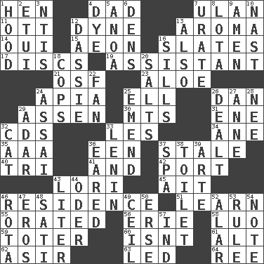 ACROSS 1. Layer 4. Male parent 7. ____ Bator 11. Baseball player Mel 12. Unit of force 13. Odor 14. Fr. "Yes" 15. Period of immesurable duration 16. Chalkboards 17. Flat circles 19. Helper 21. Order of Saint Francis (abbr.) 23. Medicinal plant 24. Capital of Western Samoa 25. Pipe bend 26. Daniel's nick name 29. NE Netherlands city 30. Mountains (abbr.) 31. Compass dir. 32. Music discs 33. French article 34. One (Scot) 35. American Automobile Association (abbr.) 36. Car or cant ending 37. Having lost freshness 40. Three (prefix) 41. Also 42. Sweet dark-red dessert wine 43. Australian parrot (variant) 45. Small island 46. Dwelling 51. Acquire or gain knowledge or skills 55. Spoke pompously 56. One of the Great Lakes 58. Nilotic language 59. Carrier 60. Is not 61. Keyboard modifier key 62. SW Saudi Arabia district 63. Directed 64. To sift DOWN 1. Parka part 2. Needle case 3. Nuclear Threat Initiatives 4. Color 5. Small Philippine buffalo 6. Cub Scout units 7. A salt of uric acid 8. Globular water bottle used in Asia 9. So be it 10. Political cartoonist Thomas 12. Hyrax 13. In addition 16. Beverly of Met fame 18. 911 reaches them 20. Table seasonings 22. Air blower 24. Slender Brazilian palm 25. Make improvements or corrections to 26. Started a card game 27. Queen of England 1702-14 28. Born 29. The sixth month of the Jewish calendar 32. Domesticated feline 33. Soviet premier 1918-24 36. Having ears or earlike features 37. Health resort 38. Bathroom plumbing fixture 39. Johnson of "Laugh-In" 43. 61 cubic inches 44. Baltic tributary 46. Round or rotation of duties 47. Greek god of love 48. Suttee (variant) 49. To provide with a ceiling 50. Celtic language 52. Having or resembling wings 53. General guideline 54. Brief written record 57. Indiana (abbr.)
