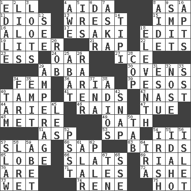 ACROSS 1. Pipe bend 4. Opera by Verdi 8. White ___ sheet 11. "Vaya con ____" 13. Obtain by seizing forcibly or violently 15. Mischievous child 16. _ vera 17. 1973 Nobel Price Winner (Physics) Leo 18. Prepare for publication 19. 61 cubic inches 21. Strike 22. Allows 23. Double-curved letter 24. Rowing implement 27. Frozen water 29. Swedish rock group 30. Baking chambers 34. Opposite of masc. 36. Operatic vocal solo 39. Mexican monetary units 40. Pack (down) 41. Is inclined (to) 43. Political cartoonist Thomas 44. Satellite of Uranus 46. Water falling in drops from the sky 47. Third day of the wk. 48. Distance measurement (Brit.) 49. Pledge 51. Viper 53. Health resort 54. One more than two 57. Volcanic refuse 60. Plant excrement 63. Avian creatures 65. Ear part 66. Narrow boards 69. Monetary unit of Yemen 70. "We ___ not amused" (Victoria) 71. Falsehoods 72. American tennis player Robert 73. Dripping 74. French philosopher Descartes 75. Being at a high temperature DOWN 1. Peak District village in England 2. Ms. Damita and namesakes 3. Plunders 4. Deep reverence 5. Big collection agency 6. Letter starter 7. "____ silly question..." 8. Helper 9. Stricken, poetically 10. Flats, for short 12. Perceive with the eye 14. Native american tent (variation) 18. Veterans Day date 20. Director Reiner 25. Blind as ____ 26. More uncommon 28. Police officer (slang) 29. Electrical Measurement 31. He sold his birthright 32. Olfactory organ 33. Fast jet (abbr.) 34. Conductor's collection 35. Send forth 37. _ tizzy (2 wds.) 38. Goodbye (Sp.) 40. Scottish cap 42. Fastener 45. French article 50. Keyboard key 52. Inconspicuous attention getter 54. From or relating to Ireland 55. Potato state 56. Small island 57. Cole _ (cabbage dish) 58. Old wives' tales, e.g. 59. Collude with 61. Having or resembling wings 62. Light colored 64. Lyricist Gershwin 67. Nine, plus one 68. Compass dir.