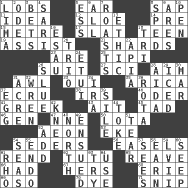 ACROSS 1. Tennis shots 5. Ewer handle 8. Plant excrement 11. The content of cognition 12. A type of plum 14. Before (prefix) 15. Distance measurement (Brit.) 17. Narrow board 18. Adolescent 19. Aid 21. Broken pieces 23. "We ___ not amused" (Victoria) 25. Native american tent (variation) 26. Set or collection 27. _-fi 28. Direct toward a target or goal 31. Leather borer 33. Fr. "Yes" 35. N. Chile seaport 37. Shade of tan 38. Big collection agency 40. Baltic tributary 41. Of Greece 43. Small island 45. Small amount or degree 46. Commissioned military rank (abbr.) 47. Compass dir. 50. Globular water bottle used in Asia 52. Age 53. Make supply last 54. Spring feasts 56. Artist's stands 61. Tear apart 62. Ballerina skirt 65. Rob, plunder, or pillage 66. Possessed 67. Possessive pronoun 68. 4th largest of the Great Lakes 69. Bear (Spanish) 70. Color 71. Sever or remove by pinching or nipping DOWN 1. Pale green bean 2. Lyric poems 3. Antes 4. Indian skirt 5. Double-curved letter 6. Everything 7. Ridicules or criticizes harshly 8. Broke a traffic law 9. Ancient Greek god of war 10. Fenced enclosure 13. Moral principle 16. He sold his birthright 18. Three (prefix) 20. Musical group of three 22. Capital of Western Samoa 24. Needle holder 26. Turn sharply 28. Opera by Verdi 29. On the rocks 30. Third mo. 31. 1/640 square mile 32. Songbird 34. Lyricist Gershwin 36. Roll call or roster of names 37. Oval reproductive body of a fowl 39. Filth; sediment 42. Leg joint 44. Puff or smoke 48. Compass direction 49. Took place subsequently 51. Pull apart 52. Increase 54. Oceans 55. Inside; within (prefix) 57. Perceives with the eye 58. Merit 59. 57 in ancient Rome 60. Ooze 61. 17th letter of the Greek alphabet 63. Attempt to accomplish something 64. Purpose