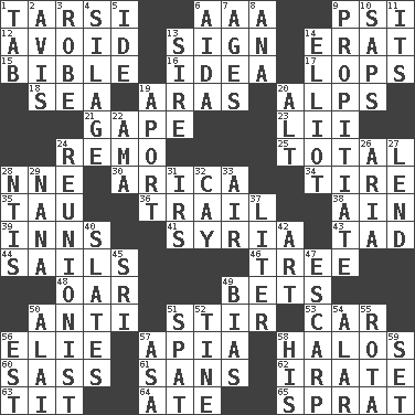ACROSS 1. Tarsus (plural) 6. American Automobile Association (abbr.) 9. Air pressure measure (abbr.) 12. Stay clear from 13. Signal 14. Part of Q.E.F. 15. God's Word 16. The main thing one is thinking about 17. Chops off 18. Ocean 19. Ancient river in northeast Turkey 20. High mountains 21. Yawn 23. Cards in a Roman deck? 24. San ____ (Riviera town) 25. "_____ Recall" 28. Compass dir. 30. N. Chile seaport 34. Hoop that covers a wheel 35. The 19th letter of the Greek alphabet 36. Lag or linger behind 38. The 18th letter of the Arabic alphabet 39. Taverns 41. Damascus' land 43. Small amount or degree 44. Moves on water 46. Relationship diagram 48. Rowing implement 49. Wagers 50. Against 51. Move through with a circular motion 53. 4-wheeled motor vehicle 56. Writer Wiesel 57. Capital of Western Samoa 58. Rings 60. Backtalk 61. Without 62. Feeling or showing extreme anger 63. Teat (slang) 64. Had dinner 65. Small fatty European fish DOWN 1. Bar bill 2. Deliberation 3. Loose flowing garment 4. Fodder prepared in a silo 5. Binary compound 6. Opera by Verdi 7. Grows older 8. Santa ___, CA 9. Conciliate 10. Plant excrements 11. It is 13. Father 14. American author Paul (1891-1958) 19. To the left, to Queeg 20. Keyboard modifier key 22. Wet nurse (var.) 24. One who advocates reunion 26. Operatic vocal solo 27. Grant temporary use of 28. Nuclear Threat Initiatives 29. Grandmother 31. Big collection agency 32. Island 33. Wind 37. 61 cubic inches 40. Chalkboards 42. Nonscientific branch of learning 45. _ Lanka 47. Fortification 49. Prejudice 50. Jai ____ 51. Argument over a trivial matter 52. Prong on a fork 54. Having or resembling wings 55. Roll call or roster of names 56. Eastern Standard Time (abbr.) 57. White ___ sheet 58. Part of HMS, perhaps 59. Arrange properly for use