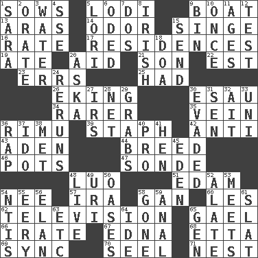 ACROSS 1. Sty mamas 5. Farming town in central California 9. Water vessel 13. Ancient river in northeast Turkey 14. Aroma 15. Scorch 16. Assign a rank or rating to 17. Dwellings 19. Had dinner 20. Assist 21. Male child 22. Eastern Standard Time (abbr.) 23. Blunders 25. Possessed 26. Supplementing with great effort 30. Son of Isaac 34. More uncommon 35. Distinctive style or manner 36. Tall New Zealand timber tree 39. Staphylococcus 42. Opposed to 43. An important port of Yemen 44. A special lineage 46. Cooking vessels 47. Message 48. Nilotic language 51. Dutch treat 54. Born 57. Retirement account (abbr.) 58. Separate the seeds from cotton 60. French article 62. Household entertainment appliance 65. Highlander 66. Feeling or showing extreme anger 67. Pulitzer Prize-winning author Ferber 68. Singer James 69. Synchronize (abbr.) 70. Sew up the eyelids of hawks and falcons 71. Egg locale DOWN 1. "Two Mules for Sister ____" 2. Declaim 3. Wetness 4. Compass dir. 5. Australian parrot (variant) 6. Wrote a lyric poem 7. Two (Sp.) 8. From or relating to Ireland 9. Storage container 10. Single time 11. Matures 12. Trial 15. Transmit 18. ___ good deed 20. "____ silly question..." 24. Summer TV shows 27. Big collection agency 28. Fish or hair follower 29. Seizes 30. Eluded 31. Elected rep. 32. Small island 33. Corn or form start 36. Reproach for some lapse or misdeed 37. Wedding promise 38. Was introduced to 40. Adept person 41. Layer 45. Paradise 48. Moving, as bait 49. RI univ. 50. Fertile tracts in a desert 52. Having winglike extensions 53. Confronts 54. Nuclear Threat Initiatives 55. Suggestive of the supernatural 56. Enthusiasm 58. Went 59. Of or related to the anus 61. Narrow board 63. And so on (abbr.) 64. Binary compound 65. Commissioned military rank (abbr.)