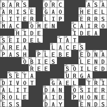 ACROSS 1. Long, evenly shaped pieces 5. The grampus (Milton) 8. White ___ sheet 11. Ascend 13. E Mali city 14. Person who is morally reprehensible 15. 61 cubic inches 16. Mouth edge 17. Blunders 18. Big _ 19. Sign of things to come 21. Capital of Egypt 22. Flintstone garb 24. The main thing one is thinking about 25. A glass for beer 27. Make lace 29. Type of rug 30. Shoestrings 32. Romantic infatuation 33. Military trainee 35. Pulitzer Prize-winning author Ferber 39. Off-Broadway awards 41. Grant temporary use of 42. Portuguese money of account (variant) 43. Dirtied 45. Bristle 48. Capital and largest city of Mongolia 49. A piece of turf (Scot.) 50. Highlander 52. Three (prefix) 55. Came down and settled, as after flight 56. One of the 12 tribes of Israel 57. Flexible twig of a willow tree 59. Hero or heavy, e.g. 60. Help 61. Give a jingle 62. Double-curved letter 63. 24 hours 64. Extremities DOWN 1. Lip ointment 2. Roberta Peters solo 3. Actors Guy, Robert Welles, and Clint 4. Compass dir. 5. Stare at amorously 6. Water falling in drops from the sky 7. Police officer (slang) 8. Nest on high 9. Father Junipero _ 10. In addition 12. Eat (away) 14. Froth on beer 20. Cartoonist voice _ Blanc 21. Quote 23. Potato state 25. Plant excrement 26. Epoch 27. Keyboard key 28. Adept person 30. French article 31. Former Milwaukee Brewers owner Bud 33. Sliced dessert 34. Area sheltered from the wind 36. Accusation by an informer 37. Compass dir. 38. Find the sum of 40. Naughty child 43. Take to court 44. Lowest deck of a ship 45. Grain storage towers 46. Vices 47. Carry 49. Have the gumption 50. Greek goddess of the earth (variant) 51. Actor Griffith 53. Tear apart 54. Angers 56. Male parent 58. A female animal or person