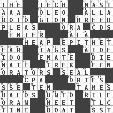 ACROSS 1. Definite Article 4. Technician 8. Vertical spar for supporting sails 12. Auto club (abbr.) 13. Margarine 14. Silent film actress Nazimova 15. Printing process, for short 17. Take by theft 18. A special lineage 19. Entreaties 21. Mouth or opening 23. Music discs 24. Keyboard key 26. Chicken ___ king 28. Pile 30. Curse 34. At a great distance 37. Labels 39. Assistant 40. Wedding promise 41. Related on the mother's side 43. Expire 44. Nathan's nickname 46. Long journey 47. Car or cant ending 48. Speakers 51. Lick closed 54. Tax preparer (abbr.) 55. Frees from moisture 58. Compass dir. 61. Nine, plus one 63. Makes less strong or intense 65. Radiant circles of light 67. To (old English) 71. Cause heat under the collar 72. Northwest Algerian city 73. Confront 74. Affectionate concern, for short 75. Prong on a fork 76. Water vessel 77. Fast jet (abbr.) DOWN 1. Canvas cover 2. White Person, in Hawaii 3. Ingested 4. Coat; cloak 5. Pipe bend 6. Corporate head (abbr.) 7. Same (prefix) 8. Spoil 9. Actor Baldwin 10. Downhill vehicle 11. Small boys 16. Pledge 18. Indonesian resort city 20. Perceive with the eye 22. Reproach for some lapse or misdeed 25. Pace 27. _ moment's notice (2 wds.) 29. Leg coverings 30. _____ Park, CO 31. Flintstone garb 32. Singer Brickell 33. Adolescent 34. Fine (Spanish) 35. The sixth month of the Jewish calendar 36. Round or rotation of duties 38. Slender fish 42. Made supply last 45. And so on (abbr.) 49. Elects 50. Actress Charlotte 52. Nonscientific branch of learning 53. One who doesn't tell the truth 56. Sends forth 57. Exchanges for money 58. Guess 59. Indian skirt 60. Enthusiasm 62. Unfeeling 64. Religious group 66. Single 68. Modern: prefix 69. Afternoon social gathering 70. Baseball player Mel