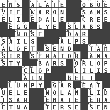 ACROSS 1. Followers of ems 4. Having winglike extensions 9. Mitch Miller's instrument 13. Compete 14. Make _____ (do battle with) 15. Without 16. Biblical high priest 17. Peak District village in England 18. Algonquian 19. Ovum 21. Sodium hydroxide 22. Broad, flat, thick pieces 24. Sense of smell 26. Rowing implement 27. Moves on water 29. High mountains 30. At or to great height 31. Transmit 33. Scottish cap 36. Title for a knight 37. Legislator 40. Nanny (var.) 41. Filthy place 42. Long, evenly shaped pieces 43. Lowest deck of a ship 45. Hoof sound 47. Ms. Damita and namesakes 48. The 18th letter of the Arabic alphabet 49. Waist strap 50. Containing lumps 52. Slender fish 54. Erode 56. Ubangi River tributary 57. Pitcher Ryan 59. Flaplike covering 61. Russian ruler of old 62. Maternal 63. Period 64. Inactive volcano in Sicily 65. Laconic 66. Elected rep. DOWN 1. Night before a holiday 2. "Death on the ____" 3. Signiory (variant) 4. Deep reverence 5. Dipping utensil 6. Like ___ of sunshine 7. Lacquered or enameled metalware 8. Compass dir. 9. Motion picture awards 10. Sharp remark 11. Washington bills 12. Compass dir. 20. _ course 22. Twentieth part of a lira 23. Pet locale 25. Fast planes 27. Backtalk 28. Came down and settled, as after flight 29. Pismires 31. Fastener 32. Hearing organ 33. Baron Munchausen's specialties 34. Mine, in Marseilles 35. Atlas contents 38. Black 39. Hero or heavy, e.g. 44. Cause heat under the collar 45. Device for capturing images 46. Mouth edge 49. Naughty children 50. For fear that 51. Uhlan (variant) 52. Went 53. Having or resembling wings 55. Hoop that covers a wheel 56. Shoshoni 57. Fish or hair follower 58. Born 60. One of the 12 tribes of Israel