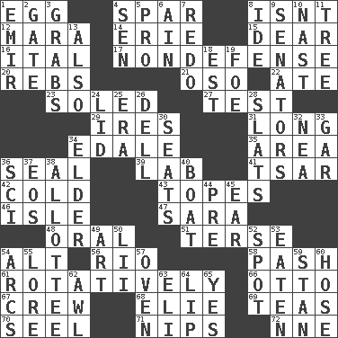 ACROSS 1. Oval reproductive body of a fowl 4. Practice fight 8. Is not 12. Hindu Mythology: god of death 14. 4th largest of the Great Lakes 15. Letter starter 16. Slanted text style (abbr.) 17. Unrelated to defense, as in spending 20. Confederate soldiers (slang) 21. Bear (Spanish) 22. Had dinner 23. Having a sole or soles 27. Trial 29. Angers 31. Protracted 34. Peak District village in England 35. Type of rug 36. Lick closed 39. Experiment locale 41. Russian ruler of old 42. Having a low temperature 43. Drinks excessively 46. Capri or Wright 47. "Two Mules for Sister ____" 48. Relating to the mouth 51. Laconic 54. The first octave above the treble staff 56. River (Sp.) 58. Romantic infatuation 61. Rotating or pertaining to rotation 66. Von Bismarck 67. Group working together 68. Writer Wiesel 69. Afternoon social gatherings 70. Sew up the eyelids of hawks and falcons 71. Cuts off 72. Compass dir. DOWN 1. Arab leader 2. Yard entry 3. Takes hold of 4. Elected rep. 5. Adept person 6. The 18th letter of the Arabic alphabet 7. Do over again 8. Binary compound 9. Legislators 10. Political cartoonist Thomas 11. Woody plant 13. In addition 18. Eastern Standard Time (abbr.) 19. Enemy 24. Flaplike covering 25. Period 26. Small valley 28. Narrow boards 30. Theater features 32. Teachers' org. 33. Slender fish 34. A person who is older than you are 36. _-fi 37. Greek goddess of the dawn 38. One to whom something is allotted 40. Water vessel 44. Before (prefix) 45. Ewer handle 49. Nonscientific branch of learning 50. Cards in a Roman deck? 52. Specific locale 53. Consumed 54. Arches 55. Old wives' tales, e.g. 57. Baking chamber 59. Comedian Laurel of Laurel & Hardy 60. Flexible conduit 62. Leather borer 63. Connecticut Ivy Leaguer 64. Mouth edge 65. Affirmative reply
