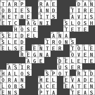 ACROSS 1. Canvas cover 5. Actress Charlotte 8. Daniel's nick name 11. Off-Broadway awards 13. Plus 14. Hoop that covers a wheel 15. Distance measurement (Brit.) 16. ___ a Wonderful Life 17. Opinion 18. And so on (abbr.) 19. Hindu god of fire 21. Agitate, as a liquid 22. Flexible conduit 24. Wig 25. Beer mug 27. Santa ___, CA 29. Downhill vehicle 30. Removes the wrinkles 32. Otherwise 33. Keyboard key 35. Lacquered or enameled metalware 39. Canadian anthropologist Darnell 41. Baking chamber 42. Grow older 43. Keyboard key 45. SW Saudi Arabia district 48. One who uses or employs something 49. Radiant circles of light 50. Specific locale 52. To free from 55. NW Algerian seaport 56. Cartoonist voice _ Blanc 57. Dodge 59. Tennis shots 60. Adept person 61. Consumed 62. Followers of ems 63. Parent Teacher Assoc. 64. Beverages made from leaves DOWN 1. Heavy book 2. Collude with 3. Actors Guy, Robert Welles, and Clint 4. For each 5. Precipitation 6. Against 7. Begley and Asner 8. A piece of turf (Scot.) 9. Get up 10. Soft 12. Gospel singer Marvin 14. Story 20. Set 21. Comedian Laurel of Laurel & Hardy 23. More peculiar 25. Compass dir. 26. Pipe bend 27. "We ___ not amused" (Victoria) 28. And not 30. Call ___ day 31. Fur scarf 33. Ovum 34. Compass dir. 36. Make much ado about nothing 37. Allow 38. Compass dir. 40. Hearing organs 43. Superhero pair 44. First name in cosmetics 45. Composer Copland 46. Thick slices 47. Charged particles 49. Hollow 50. Religious group 51. Entreaty 53. The main thing one is thinking about 54. Habitations of wild animals 56. Atlas unit 58. Large container