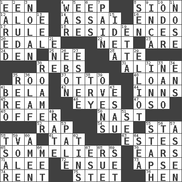 ACROSS 1. Car or cant ending 4. Shed a tear 8. The Jewish people; Israel 12. _ vera 14. Slender Brazilian palm 16. Inside; within (prefix) 17. General guideline 18. Homes 20. Peak District village in England 22. Fish or hair follower 23. "We ___ not amused" (Victoria) 24. Lair 25. Born 28. Had dinner 30. Confederate soldiers (slang) 31. Place in a line 35. Friend of Pooh 37. "Beetle Bailey" pooch 40. Grant temporary use of 41. Actor Lugosi 42. Effrontery 44. Lodging establishments 45. 480, 500 or 516 sheets of paper 46. Sight organs 47. Bear (Spanish) 48. Auction bid 50. Political cartoonist Thomas 52. Reproach for some lapse or misdeed 54. Institute legal proceedings 55. R.R. building 58. Federal power corp. 61. Make lace 63. _____ Park, CO 65. Wine waiters 70. Hearing organs 71. Toward shelter 72. Take place subsequently 73. Domed church section 74. Monthly bill 75. Proofreading order 76. Layer DOWN 1. Having ears or earlike features 2. Evade 3. Pitcher Ryan 4. Armed conflict 5. Compass dir. 6. Double-curved letter 7. Ache 8. Elected rep. 9. South American Indian 10. River in Europe 11. Olfactory organ 13. Snakelike fish 15. The main thing one is thinking about 19. Singer James 21. Compass dir. 26. Inky black, to poets 27. First name in cosmetics 29. American author Paul (1891-1958) 30. Wanderer 32. Charged particles 33. Billionth: prefix 34. Followers of ems 35. Coral collection 36. Norwegian king 38. Attempt to accomplish something 39. Baking chambers 41. Sis' sibling 43. He sold his birthright 49. Assign a rank or rating to 51. Perceive with the eye 53. Light colored 55. Staphylococcus 56. Laconic 57. NE Netherlands city 58. Russian ruler of old 59. Grand slam 60. So be it 62. Canisters 64. Ocean 66. Was introduced to 67. Eastern Standard Time (abbr.) 68. Regret 69. Arrange properly for use