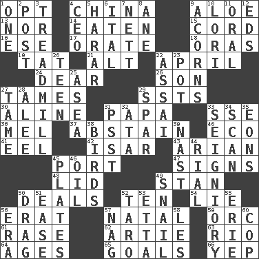 ACROSS 1. Choose 4. Large country 9. Medicinal plant 13. And not 14. Consumed 15. Drawstring 16. Compass dir. 17. Declaim 18. Mouths or openings 19. Make lace 21. Keyboard modifier key 22. Showery time 24. Letter starter 26. Male child 27. Makes less strong or intense 29. Fast planes 30. Place in a line 31. Dad 33. Compass dir. 36. Cartoonist voice _ Blanc 37. Choose not to consume 40. Environmental prefix 41. Snakelike fish 42. Austrian river, tributary to the Danube 43. Believer in; advocate of (suffix) 45. Sweet dark-red dessert wine 47. Signals 48. Flaplike covering 49. Comedian Laurel of Laurel & Hardy 50. Allots cards 52. "___ Little Indians" 54. Untruth 56. Part of Q.E.F. 57. Relating to or accompanying birth 59. The grampus (Milton) 61. Raze (variant) 62. Nick name for Arthur 63. _ de Janeiro 64. Eras 65. Finish lines 66. Slangy assent DOWN 1. Single 2. Mail 3. Excercise machine 4. Corporate head (abbr.) 5. Ethiopian city, capital of Harari 6. Slanted text style (abbr.) 7. Remaining after all deductions 8. A saturated hydrocarbon 9. Oak nuts 10. Australian parrot (variant) 11. Of the mouth 12. Begley and Asner 20. Adolescent 22. Slender Brazilian palm 23. Plant holder 25. At sea 27. Docile 28. Toward shelter 29. Practice fight 31. Inconspicuous attention getter 32. "One Day ___ Time" 33. Signiory (variant) 34. Skim 35. Immeasurably long periods of time 38. Avian creatures 39. Political cartoonist Thomas 44. Monetary unit of Yemen 45. Food holders 46. Lubricate 49. Slow-paced one 50. To trail on the ground 51. Relaxation 52. Pacific island yam 53. Singer James 55. One of the Great Lakes 56. Period 57. Tired old horse 58. French article 60. Police officer (slang)