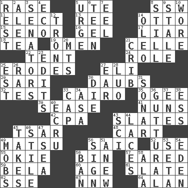 ACROSS 1. To erase 5. Shoshoni 8. Compass dir. 11. Choose 13. Portuguese money of account (variant) 14. Von Bismarck 15. Sir (Sp.) 16. Set 17. One who doesn't tell the truth 18. Beverage made from leaves 19. Sign of things to come 21. Cell (Danish) 22. Portable shelter 24. Hero or heavy, e.g. 25. Eats (away) 27. Biblical high priest 29. Indian skirt 30. Applies to a surface 32. Trial 33. Capital of Egypt 35. Double curve, resembling the letter S 39. Gospel singer Marvin 41. Religious women 42. Tax preparer (abbr.) 43. Chalkboards 45. Russian ruler of old 48. Heavy open wagon 49. Taiwanese island in East China Sea 50. Ketch in the Levant 52. Purpose 55. Migrant worker of the '30s 56. Storage container 57. Having ears or earlike features 59. Actor Lugosi 60. Ripen 61. Chalkboard 62. Compass dir. 63. Compass dir. 64. Actor Alda or Thicke DOWN 1. Take ten 2. Toward shelter 3. Elected representatives 4. Environmental prefix 5. Goad 6. Adolescent 7. Snakelike fish 8. Free from disturbance or agitation 9. Showing deterioration from age 10. Had on 12. Heavy duty weighing machine 14. Butter sub 20. Mountains (abbr.) 21. Baby bed with high sides 23. Proofreads 25. Eastern Standard Time (abbr.) 26. Actress Charlotte 27. Hearing organ 28. Nilotic language 30. Pass on 31. Underwater navigation system 33. Head covering 34. White ___ sheet 36. From the throat 37. Compass dir. 38. Double-curved letter 40. Shade of tan 43. _-fi 44. Shoestrings 45. Receives possession of 46. Vertical member of a panel or frame 47. Toward the sea 49. Crowds into 50. Attach a signature 51. Afresh 53. Stalk of a moss capsule 54. Genesis locale 56. Forbid 58. Chicken ___ king