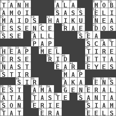 ACROSS 1. Hyperbolic tangent 5. Wing 8. Disorderly crowd 11. Mine, in Marseilles 12. Backtalk 14. Connecticut Ivy Leaguer 15. Unmarried girls 17. Japanese poetic form 18. Teachers' org. 19. Center 21. Actress Charlotte 22. Two (Sp.) 23. Compass dir. 24. 100% 25. Ocean 27. Infant food 28. Go away! 31. Pile 35. Cartoonist voice _ Blanc 37. Hoop that covers a wheel 38. Celtic language 39. To free from 41. Singer James 42. Political cartoonist Thomas 43. Hearing organ 45. Sight organs 46. Disorderly outburst 47. Atlas unit 49. Title for a knight 51. Alias (abbr.) 52. Followers of ems 55. Eastern Standard Time (abbr.) 57. Nursemaid (var.) 60. Commissioned military rank 62. _ moment's notice (2 wds.) 63. Clothes sense 65. Before Barbara or Clara 66. Boy, to dad 67. 4th largest of the Great Lakes 68. Thailand, formerly 69. Make lace 70. Period 71. Snakelike fish DOWN 1. Softens 2. Collect or gather 3. Annoying sound 4. Flintstone garb 5. White ___ sheet 6. Den 7. "____ silly question..." 8. Ananias' fault 9. Margarine 10. Prejudice 13. Takes to court 16. Fastener 17. Aide 20. Dollar (slang) 26. First name in cosmetics 29. Johnson of "Laugh-In" 30. Afternoon social gatherings 31. Coop moms 32. Part of Q.E.F. 33. Aide 34. _ dish (used to culture cells) 36. Falsehood 40. Break 44. Immoral or dissolute person 48. Zero-star reviews 50. Pace 52. Bert's buddy 53. Relating to or accompanying birth 54. Shuts with force 55. 90 degrees 56. Portico 58. Female horse 59. SW Saudi Arabia district 61. Relaxation 64. Beverage made from leaves