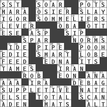 ACROSS 1. Fast jet (abbr.) 4. Fly high 8. Cooking vessels 12. Hindu Mythology: god of death 14. Flexible twig of a willow tree 16. Kill 17. Composer Stravinsky 18. Wine waiters 20. Prying instrument 22. Chief or king in Benin or Nigeria 23. Baseball player Mel 24. Compass dir. 25. Viper 28. Small drink 30. Coast Guard woman 31. Typical standards 35. Binary compound 37. Corncob 40. "Silly old bear" 41. Singer Brickell 42. Don Adams' spy role 44. Ear part 45. Nourish 46. Pulitzer Prize-winning author Ferber 47. It is 48. Makes less strong or intense 50. SW Asia republic 52. Director Reiner 54. Age 55. Santa ___, CA 58. American Automobile Association (abbr.) 61. Lyricist Gershwin 63. Debunk (Brit. slang) 65. Supplying deficiencies 70. Nathan's nickname 71. Otherwise 72. "_____ Recall" 73. Examine hastily 74. Arabian gulf 75. Floor coverings 76. The first octave above the treble staff DOWN 1. Grin 2. Gurus 3. Collection of objects 4. Mayday 5. Bear (Spanish) 6. Direct toward a target or goal 7. San ____ (Riviera town) 8. 23rd letter of the Greek alphabet 9. Butter sub 10. Small pie 11. System (abbr.) 13. "We ___ not amused" (Victoria) 15. Confederate soldiers (slang) 19. (Had) reclined 21. Hit sharply and swiftly 26. Plant excrements 27. A-one 29. Cotton for raincoats, e.g. 30. Sowing specialist 32. Carrot, for example 33. Crowds into 34. A female animal or person 35. It may be bright or harebrained 36. South Vietnam president (1954) 38. Groovy apt. 39. Bert's buddy 41. Bank Draft (abbr.) 43. Pacific island yam 49. Earth 51. Also 53. Cy Young winner Saberhagen 55. Phillipine bananalike plant 56. Relating to or accompanying birth 57. Rep 58. Toward the sea 59. Old (Scot.) 60. Domed church section 62. Smallest unit of an element 64. Followers of ems 66. Animal enclosure 67. Call ___ day 68. Large container 69. Raised railways