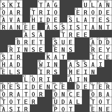 ACROSS 1. What Jean-Claude Killy likes to do 4. Label 7. Uhlan (variant) 11. Boat paddle 12. Musical group of three 13. Eat (away) 14. Actress Gardner 15. Flintstone garb 16. Chalkboards 17. The wife of a rajah (variant) 19. Aide 21. White ___ sheet 23. Family _ (genealogy) 24. Cy Young winner Saberhagen 25. Take to court 26. Increase 29. Remove soap 30. Followers of ems 31. Marina Del _, California 32. Title for a knight 33. Krazy ___ of comics 34. Frozen water 35. Possessed 36. Acquire through effort 37. Slender Brazilian palm 40. Raised railways 41. Big collection agency 42. Chow _ 43. Australian parrot (variant) 45. The 18th letter of the Arabic alphabet 46. Home 51. Prevent from occurring 55. Speaker 56. Single time 58. Chief or king in Benin or Nigeria 59. Carrier 60. Hereditary estate 61. Small child 62. SW Saudi Arabia district 63. Plant holder 64. Compass dir. DOWN 1. Fly high 2. Polynesian shrub of the pepper family 3. SW Asia republic 4. Three (prefix) 5. Opera by Verdi 6. Leaves 7. A salt of uric acid 8. Globular water bottle used in Asia 9. Arabian gulf 10. A home for chicks 12. College papers 13. Otherwise 16. Fathers 18. Merit 20. Difficult or unusual or dangerous feat 22. Had dinner 24. Avian creatures 25. Actors Connery and Penn 26. Believer in; advocate of (suffix) 27. Tenth: prefix 28. Color 29. Monetary unit of Yemen 32. A female animal or person 33. Japanese brewing company 36. One who wires 37. Nanny (var.) 38. A glass for beer 39. Trig term 43. 61 cubic inches 44. Scent 46. Roll call or roster of names 47. Greek god of love 48. Suttee (variant) 49. Clever action or accomplishment 50. Inside; within (prefix) 52. Carryall 53. Inky black, to poets 54. Assign a rank or rating to 57. Feline