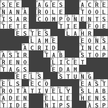 ACROSS 1. Perceive with the eye 4. Eons 8. 43,560 square feet 12. Grandmother 14. Hero or heavy, e.g. 15. Instrument 16. Austrian river, tributary to the Danube 17. Pieces 20. False hair 21. Make a knot 22. Enemy 23. _____ Park, CO 27. Cowardly lion portrayer 29. Unable to walk 31. Immeasurably long periods of time 34. Sour-tasting 35. South American Indian 36. SW Saudi Arabia district 39. Bar bill 41. Cease 42. Former U.S. Attorney General Janet 43. It is permitted: Lat. 46. Labels 47. Dutch treat 48. Snakelike fish 51. Feeling sharp psychological pain 54. Raised railways 56. Environmental prefix 58. Compass direction 61. Happening in regular succession 66. Broad, flat, thick piece 67. Arabian gulf 68. Writer Wiesel 69. Coop moms 70. Periodic rise and fall of the sea level 71. Pinches, bites 72. Cleo's killer DOWN 1. In a ____ (agitated or irritated) 2. Comfort 3. Related on the mother's side 4. Curve 5. Thick or sticky substance 6. Shade tree 7. Back-to-school mo. 8. Had dinner 9. Meet 10. Printing process, for short 11. Otherwise 13. Ancient Greek god of war 18. Petroleum 19. Teachers' org. 24. Affectionate concern, for short 25. Hearing organ 26. Stricken, poetically 28. Robbery 30. Peak District village in England 32. Non-commissioned officer (abbr.) 33. Plant excrement 34. Came up 36. Tate display 37. Ocean 38. Eaten 40. Auction offers 44. Feline 45. Australian flightless bird 49. Allow 50. _-fi 52. Tender 53. An organ shaped like a helmet 54. Part of Q.E.F. 55. Farming town in central California 57. Baking chamber 59. Without 60. Cook's measure (abbr.) 62. One (Scot) 63. Connecticut Ivy Leaguer 64. Mouth edge 65. Affirmative reply