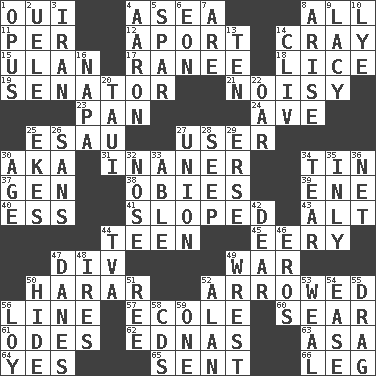 ACROSS 1. Fr. "Yes" 4. At sea 8. Everything 11. For each 12. To the left, to Queeg 14. Supercomputer manufacturer 15. ____ Bator 17. The wife of a rajah (variant) 18. Louse (plural) 19. Elected representative 21. Annoyingly loud 23. Baking dish 24. "___ Maria" 25. Son of Isaac 27. One who uses or employs something 30. Alias (abbr.) 31. More empty; more void 34. Metal container 37. Commissioned military rank (abbr.) 38. Off-Broadway awards 39. Compass dir. 40. Curvy letter 41. Slanted 43. Keyboard modifier key 44. Adolescent 45. Suggestive of the supernatural 47. HTML Container Element 49. Armed conflict 50. Ethiopian city, capital of Harari 52. Moved like an arrow 56. Actor's bit 57. Learning spot: Fr. 60. Dry up 61. Lyric poems 62. Ferber et al. 63. White ___ sheet 64. Consenting reply 65. Posted 66. Part of a journey DOWN 1. Musical composition 2. Ubangi River tributary 3. SW Asia republic 4. Composer Copland 5. Practice fight 6. Period of immesurable duration 7. "We ___ not amused" (Victoria) 8. Ascend 9. Made of lace 10. Sodium hydroxide 13. "___ Little Indians" 14. 154 in Roman numerals 16. California wine valley 20. "Change" in Tahitian 22. Rowing implement 25. Supplements with great effort 26. Without 27. The state of being joined or united 28. Ooze 29. Celtic language 30. Grow older 32. Characteristic smell of wine 33. Competent 34. Pull apart 35. Inwardly 36. Fish or hair follower 42. Letter starter 44. Federal power corp. 46. Greek god of love 47. Natives or inhabitants of Denmark 48. Angers 49. Obtain by seizing forcibly or violently 50. Flintstone garb 51. Portuguese money of account (variant) 52. Actor Alda or Thicke 53. Welt 54. Comfort 55. To be drawn or hauled along 56. Myrna of the movies 58. Music discs 59. Single