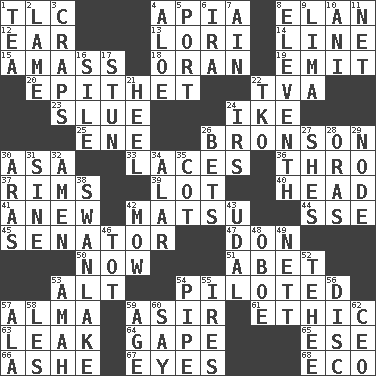 ACROSS 1. Affectionate concern, for short 4. Capital of Western Samoa 8. Flair 12. Hearing organ 13. Australian parrot (variant) 14. Actor's bit 15. Collect or gather 18. NW Algerian seaport 19. Give off 20. Curse 22. Federal power corp. 23. Turn sharply 24. D.D.E's nickname 25. Compass dir. 26. "Death Wish" actor 30. White ___ sheet 33. Shoestrings 36. Through, poetically 37. Basketball hoops 39. Car dealer's back yard 40. Froth on beer 41. Afresh 42. Taiwanese island in East China Sea 44. Compass dir. 45. Elected representative 47. Spanish title 50. Immediately 51. Collude with 53. Keyboard modifier key 54. Manned the helm 57. _ mater 59. SW Saudi Arabia district 61. Value system 63. Path through which fluid escapes 64. Open wide 65. Compass dir. 66. American tennis player Robert 67. Sight organs 68. Environmental prefix DOWN 1. Beverage made from leaves 2. Unable to walk 3. Dice game 4. Medicinal plant 5. Sweet dark-red dessert wine 6. Lyricist Gershwin 7. The 18th letter of the Arabic alphabet 8. Veterans Day date 9. Pale green bean 10. Black tropical American cuckoo 11. Fish or hair follower 16. Drop; flow; fall 17. Astound 21. Person who is morally reprehensible 22. Ring climax 24. Big collection agency 26. Antes 27. "______ My Girl" (Turtles hit) 28. Mouths or openings 29. Thickened enlargement 30. Ancient river in northeast Turkey 31. Trig term 32. So be it 34. Having or resembling wings 35. Small bed 38. Tchaikovsky ballet 42. Cut the grass 43. Hereditary estate 46. Small child 48. Mitch Miller's instrument 49. Remaining after all deductions 52. Giggle 53. Nursemaid 54. Corncob 55. Angers 56. Plate 57. Chicken ___ king 58. French article 59. Mature 60. Declare 62. Corporate head (abbr.)