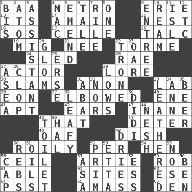ACROSS 1. Sound made by sheep 4. Paris' subway 9. 4th largest of the Great Lakes 13. ___ a Wonderful Life 14. With great haste 15. A home for chicks 16. Mayday 17. Cell (Danish) 18. Baby powder 19. Russian fighter aircraft 21. Born 22. Singer Mel 24. Downhill vehicle 26. Actress Charlotte 27. Thespian 29. Old wives' tales, e.g. 30. Shuts with force 31. At once, immediately (arch.) 33. Experiment locale 36. Age 37. Turned at an angle; bent 40. Compass dir. 41. Fitting 42. Hearing organs 43. Empty; void 45. Not this but _ 47. Prevent from occurring 48. Clumsy lout 49. Food container 50. Agitated, as a liquid 52. For each 54. Layer 56. To provide with a ceiling 57. Nick name for Arthur 59. Director Reiner 61. Competent 62. Locates 63. Compass dir. 64. Inconspicuous attention getter 65. Collect or gather 66. Lair DOWN 1. Twice 2. Tiny particle 3. Aide 4. Apple computer (short form) 5. Make improvements or corrections to 6. Falsehood 7. Cause heat under the collar 8. Single 9. Main course 10. 480, 500 or 516 sheets of paper 11. Small island 12. And so on (abbr.) 20. Seize upon or latch onto something 22. Heavy duty weighing machine 23. Boat paddle 25. Celtic language 27. At sea 28. Hoof sound 29. Coldest temperatures 31. Blind as ____ 32. Not either 33. Resembling or made to resemble leather 34. Queen of England 1702-14 35. Fermented drink made from hops 38. Like summer trees 39. "You Light Up My Life" star Conn 44. Soft 45. Rest room 46. Actor Linden 49. Frees from moisture 50. Confederate soldiers (slang) 51. Lubricates 52. Demure 53. Singer James 55. Sense of smell 56. Head covering 57. White ___ sheet 58. Double-curved letter 60. Benjamin's nick name
