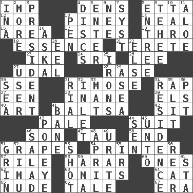 ACROSS 1. Mischievous child 4. Hiding places for outlaws 8. Singer James 12. Or not 13. Abounding in pines 14. Be tempered by heat 15. Length times width 17. _____ Park, CO 18. Through, poetically 19. Gist 21. Cigar-shaped 23. Mamie's mate 24. _ Lanka 26. Area sheltered from the wind 27. Allodial 28. To erase 30. Compass dir. 31. Full of chinks, cracks, or crevices 34. Strike 37. Car or cant ending 38. Empty; void 39. Raised railways 40. Tate display 41. Greek mezzo-soprano Agnes 42. Be seated 43. Light colored 44. Set of matching outer garments 46. Boy, to dad 47. The 19th letter of the Greek alphabet 50. Conclusion 51. Raisin fruits 54. Hard copy producer 57. Cause heat under the collar 58. Ethiopian city, capital of Harari 60. Singles 62. "If ____ say so..." 63. Leaves out 64. Domesticated feline 65. Naked 66. Story 67. Period DOWN 1. _ tizzy (2 wds.) 2. Greater amount 3. Elected leader of a country 4. Flat circles 5. Keyboard key 6. Born 7. System (abbr.) 8. Main course 9. Giggle 10. Small pie 11. _ vera 13. Writing instrument 16. "____ silly question..." 20. Snakelike fish 22. Otherwise 25. Metal shackles 27. One who uses or employs something 29. At sea 30. Ocean 31. Monetary unit of Yemen 32. An arm off of a larger body of water 33. Floor covering 34. Home 35. Came down and settled, as after flight 36. Pacific Standard Time (abbr.) 41. Object of repulsion 43. Wimpy's pal 44. Elected rep. 45. To (old English) 46. First course 48. Showery time 49. A salt of uric acid 51. Smile widely 52. Tall New Zealand timber tree 53. Went for two points 55. Big collection agency 56. Tail end 59. Housemaid (var.) 61. R.R. building