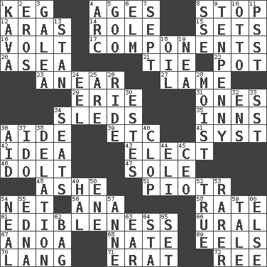 ACROSS 1. Cask 4. Grows older 8. Constrict 12. Ancient river in northeast Turkey 14. Hero or heavy, e.g. 15. Puts into a specified state 16. Electrical Unit 17. Pieces 20. Toward the sea 21. Standoff 22. Cooking vessel 23. Approach 27. Unable to walk 29. 4th largest of the Great Lakes 31. Washington bills 34. Bobsleighs 35. Restaurants 36. Assistant 39. And so on (abbr.) 41. System (abbr.) 42. The content of cognition 43. Opt 46. Stupid person 47. Not divided or shared with others 48. American tennis player Robert 51. Peter (Polish) 54. Fish or hair follower 56. Santa ___, CA 58. Pace 61. The property of being fit to eat 66. Mountain range 67. Small Philippine buffalo 68. Nathan's nickname 69. Snakelike fish 70. Long (Scottish) 71. Part of Q.E.F. 72. To sift DOWN 1. Polynesian shrub of the pepper family 2. Greek god of love 3. An organ shaped like a helmet 4. Curve 5. Thick or sticky substance 6. Shade tree 7. Back-to-school mo. 8. Compass dir. 9. 3-inch nail 10. "Beetle Bailey" pooch 11. Inconspicuous attention getter 13. Comedian Laurel of Laurel & Hardy 18. Lubricate 19. Teachers' org. 24. Snakelike fish 25. "We ___ not amused" (Victoria) 26. Travel on an animal 28. Wet 30. _____ Park, CO 32. Followers of ems 33. Fast jet (abbr.) 34. Theater features 36. Assist 37. Wedding promise 38. Accusation by an informer 40. Hoof sound 44. Connecticut Ivy Leaguer 45. Corporate head (abbr.) 49. Actor Linden 50. Compass dir. 52. Loyal 53. Less widely known 54. Be tempered by heat 55. Pulitzer Prize-winning author Ferber 57. Queen of England 1702-14 59. Story 60. Otherwise 62. Container for groceries 63. Hearing organ 64. R.R. building 65. Put into a specified state