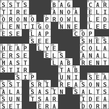 ACROSS 1. Fast planes 5. Paper or plastic container 8. 4-wheeled motor vehicle 11. Become fatigued 12. Small Philippine buffalo 14. Connecticut Ivy Leaguer 15. U. of Maine site 17. Move like a hungry wolf 18. Directed 19. Small, flat, pigmented spot on the skin 21. Compass dir. 22. Area sheltered from the wind 23. Compass dir. 24. Infant locale 25. Police officer (slang) 27. Perceive with the eye 28. "______ My Girl" (Turtles hit) 31. Pile 35. Potassium hydroxide 37. Root beer relative 38. Celtic language 39. Raised railways 41. Of or related to the anus 42. Vertical spar for supporting sails 43. Experiment locale 45. Monthly bill 46. Disorderly outburst 47. Bar bill 49. Small drink 51. Single; one (prefix) 52. Ocean 55. Fast jet (abbr.) 57. Indian title of respect (Mr.) 60. Thinks logically 62. In the manner of 63. Indian antelope 65. Table seasonings 66. Player for Phoenix 67. Russian ruler of old 68. The main thing one is thinking about 69. Put into a specified state 70. Period 71. Dormintory (informal) DOWN 1. Took without asking 2. Male parents of animals 3. Marketplace scale 4. Posted 5. Drinking establishment 6. Soon (poet.) 7. Bride's dress 8. Portable communications device 9. Toward shelter 10. Travel on or in a vehicle 13. Actor Baldwin 16. Lubricates 17. Wimpy's pal 20. Highlander 26. Witty Wilde 29. Enthusiasm 30. Table seasoning 31. Folds over and sews together 32. Part of Q.E.F. 33. Helper 34. _ dish (used to culture cells) 36. Pipe bend 40. Titan orbits this 44. Object of repulsion 48. Prejudice 50. Inconspicuous attention getter 52. Twentieth part of a lira 53. Keyboard key 54. Indian state 55. Backtalk 56. Turn sharply 58. To erase 59. Austrian river, tributary to the Danube 61. Stated 64. Lyricist Gershwin