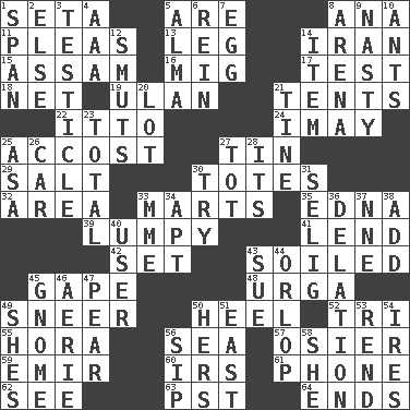 ACROSS 1. Bristle 5. "We ___ not amused" (Victoria) 8. Santa ___, CA 11. Entreaties 13. Part of a journey 14. SW Asia republic 15. Indian state 16. Russian fighter aircraft 17. Trial 18. Fish or hair follower 19. ____ Bator, Mongolia 21. Portable shelters 22. "Tell ____ the Marines!" 24. "If ____ say so..." 25. Buttonhole 27. Shallow baking pan 29. Table seasoning 30. Hauls 32. Length times width 33. Shops 35. Pulitzer Prize-winning author Ferber 39. Containing lumps 41. Grant temporary use of 42. Arrange properly for use 43. Dirtied 45. Yawn 48. Capital and largest city of Mongolia 49. Contemptuous expression 50. The bottom of a shoe or boot 52. Three (prefix) 55. Israeli folk dance 56. Ocean 57. Flexible twig of a willow tree 59. Arab leader 60. Big collection agency 61. Give a jingle 62. Observe 63. Pacific Standard Time (abbr.) 64. Conclusions DOWN 1. Connect, as a bridge 2. Otherwise 3. One of the two male reproductive glands 4. Auto club (abbr.) 5. _ mater 6. It's straight from the horse's mouth 7. Oval reproductive body of a fowl 8. Sports stadium 9. Smutty 10. Pismires 12. Particles of soot 14. Detail 20. Car dealer's back yard 21. Prong on a fork 23. "_____ Recall" 25. White ___ sheet 26. Automobile 27. Small child 28. ___ a Wonderful Life 30. Attempt 31. Major League Baseball Commissioner Bud 33. Madame (abbr.) 34. Fitting 36. Conveyance 37. Compass dir. 38. Increase 40. One who uses or employs something 43. Institute legal proceedings 44. Lowest deck of a ship 45. Dwarf 46. Nest on high 47. Lightbulb-shaped fruit 49. "______ My Girl" (Turtles hit) 50. Possessive pronoun 51. 90 degrees 53. Tear apart 54. Angers 56. Small drink 58. A female animal or person